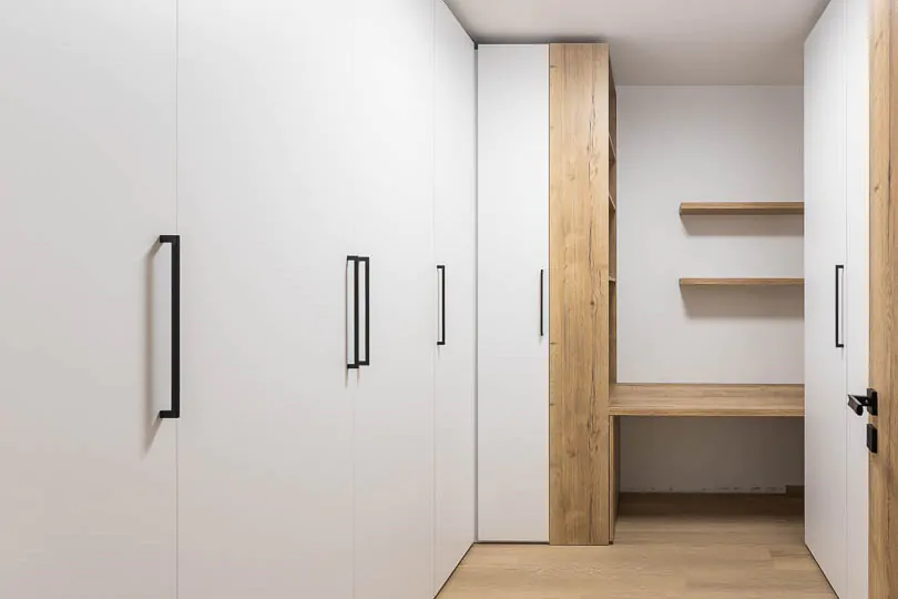 Zum Bau gehört auch ein Ankleidezimmer mit geschlossenen Schränken.
