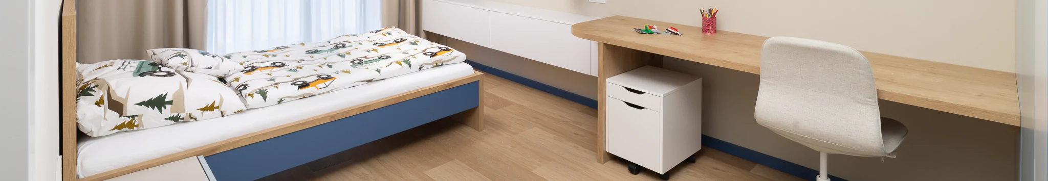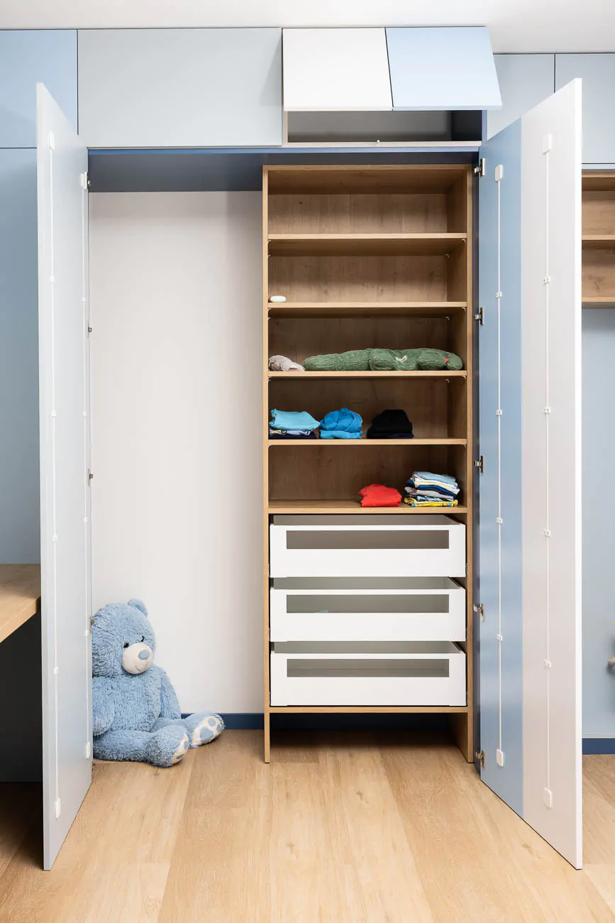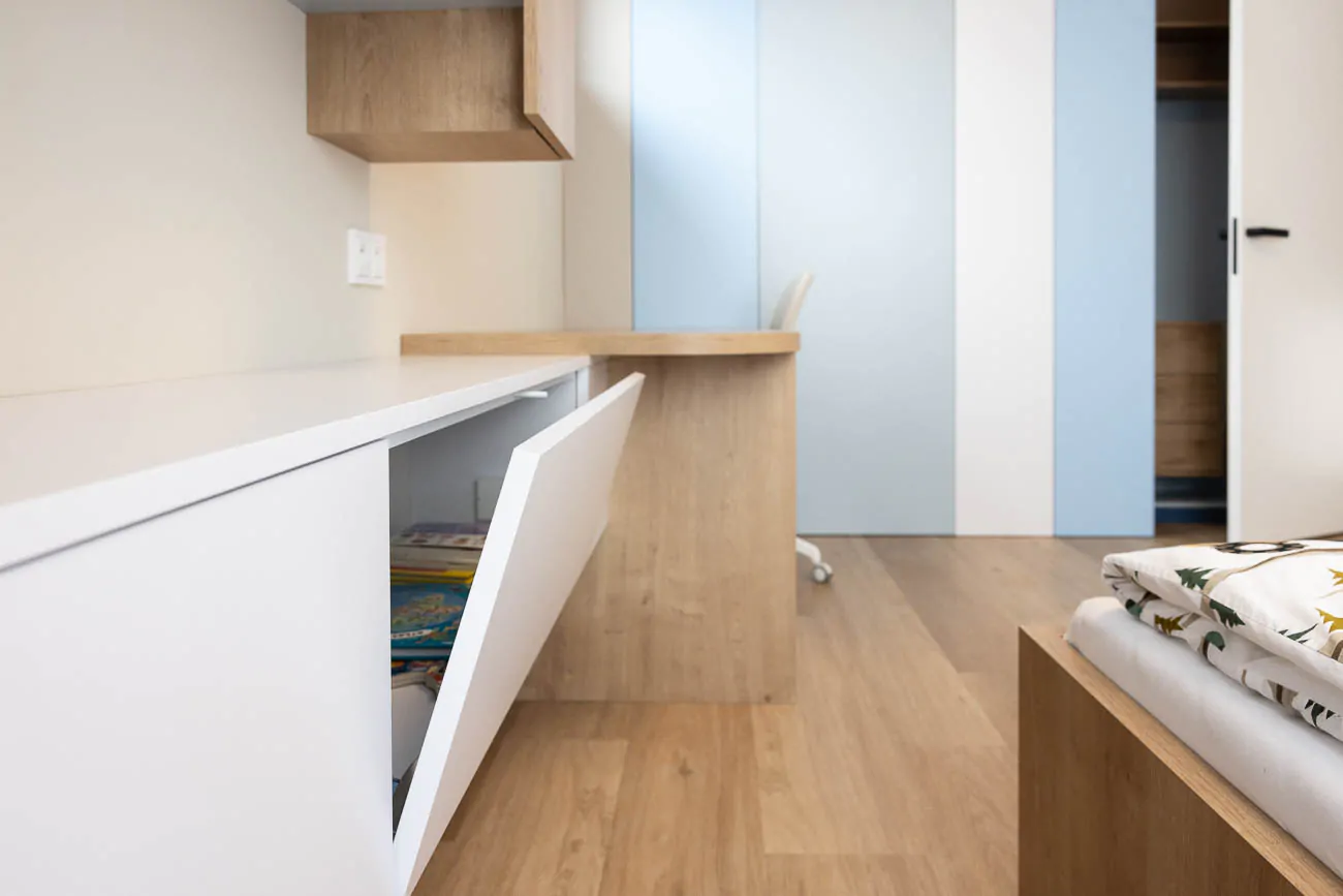 Tento dětský pokoj je navržený s důrazem na funkčnost, přehlednost a dlouhou životnost. Prostor je rozdělený do jasných zón – spaní, učení a ukládání – tak, aby pokoj dobře fungoval v každodenním provozu a zároveň zůstal vzdušný a klidný.