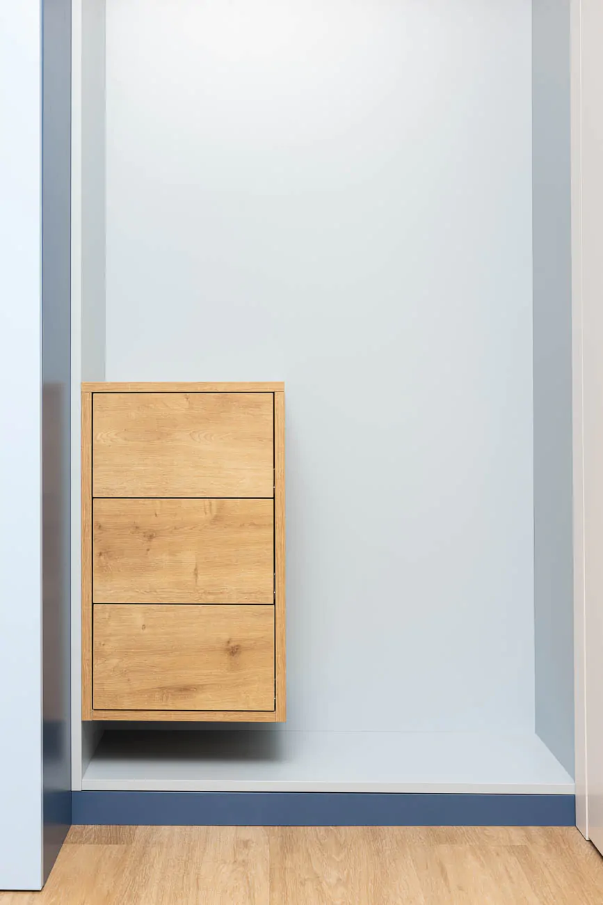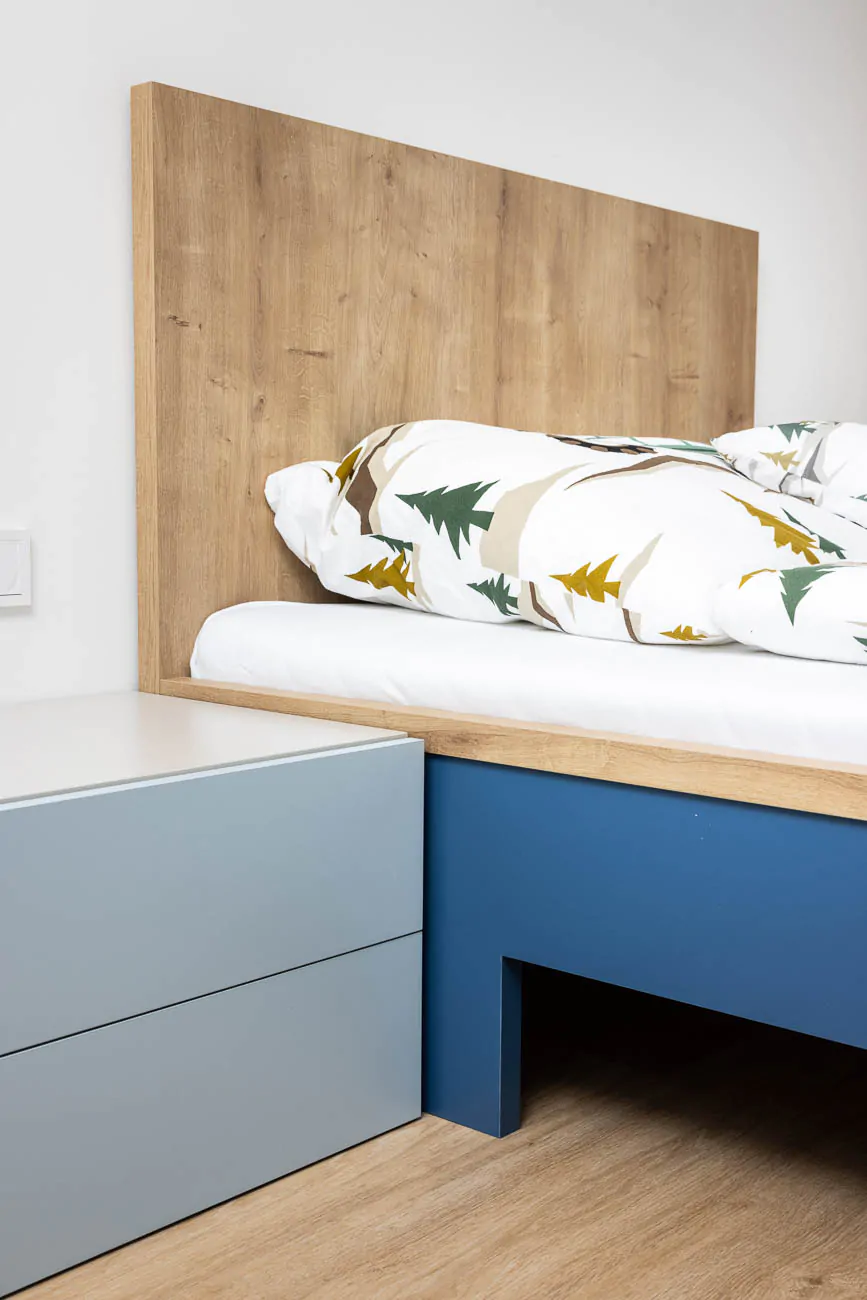 Barevná kombinace světlých ploch, jemných modrých tónů a přírodního dřeva působí nadčasově a snadno se přizpůsobí změnám vkusů i potřeb dítěte.