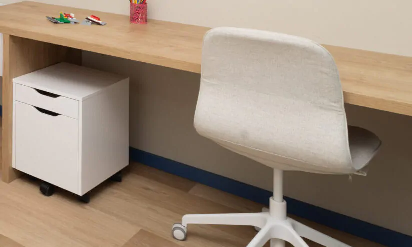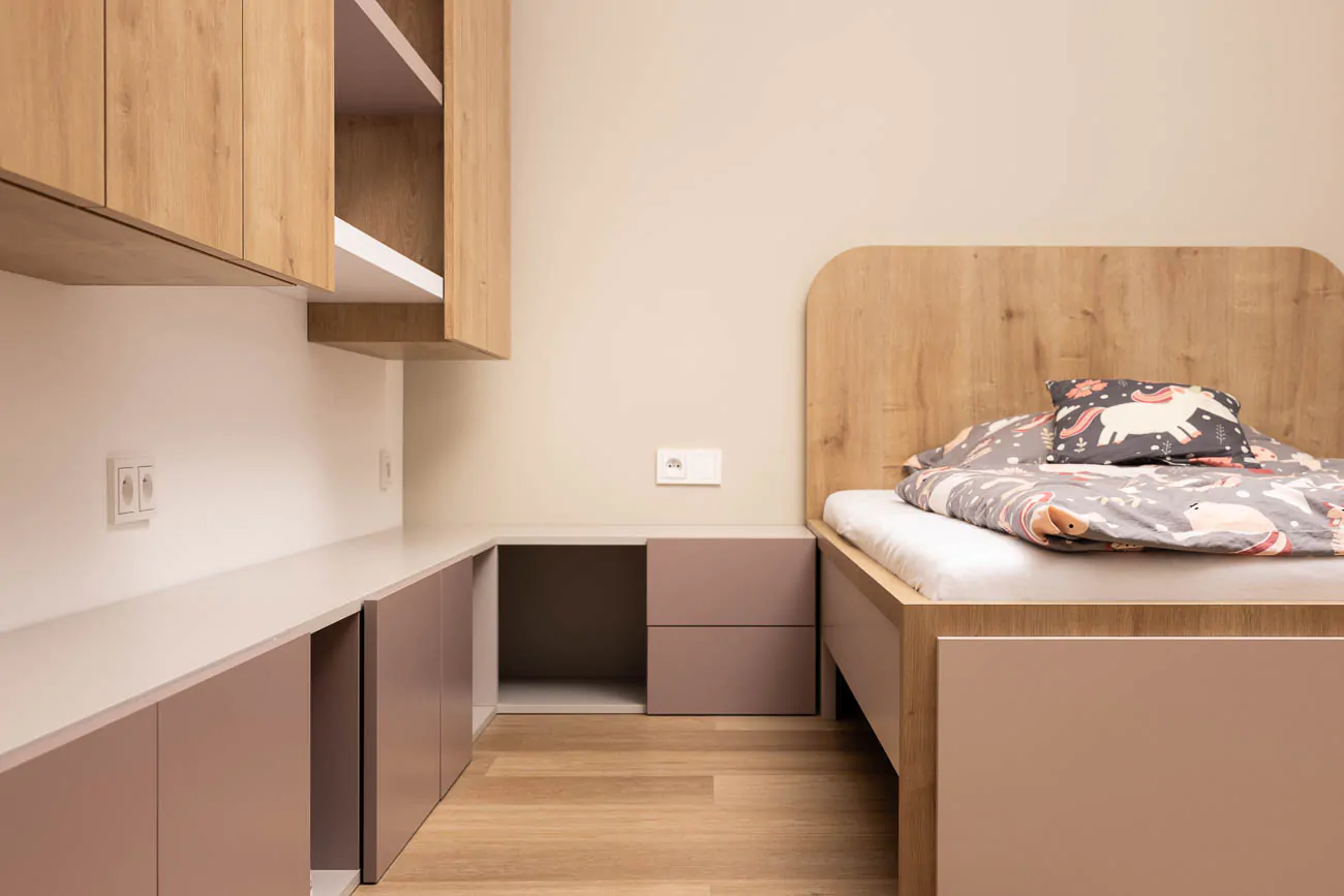 Tento dětský pokoj je navržený s důrazem na funkčnost, přehlednost a dlouhou životnost. Prostor je rozdělený do jasných zón – spaní, učení a ukládání – tak, aby pokoj dobře fungoval v každodenním provozu a zároveň zůstal vzdušný a klidný.