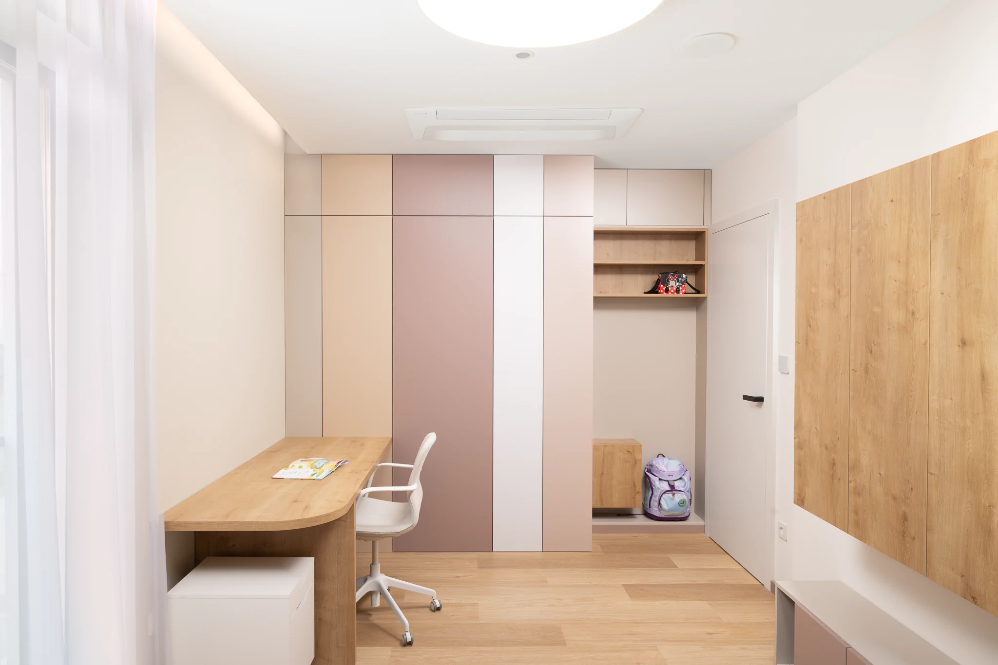 Barevná kombinace světlých ploch, jemných odstínů růžové, béžové a přírodního dřeva působí nadčasově a snadno se přizpůsobí změnám vkusů i potřeb dítěte.