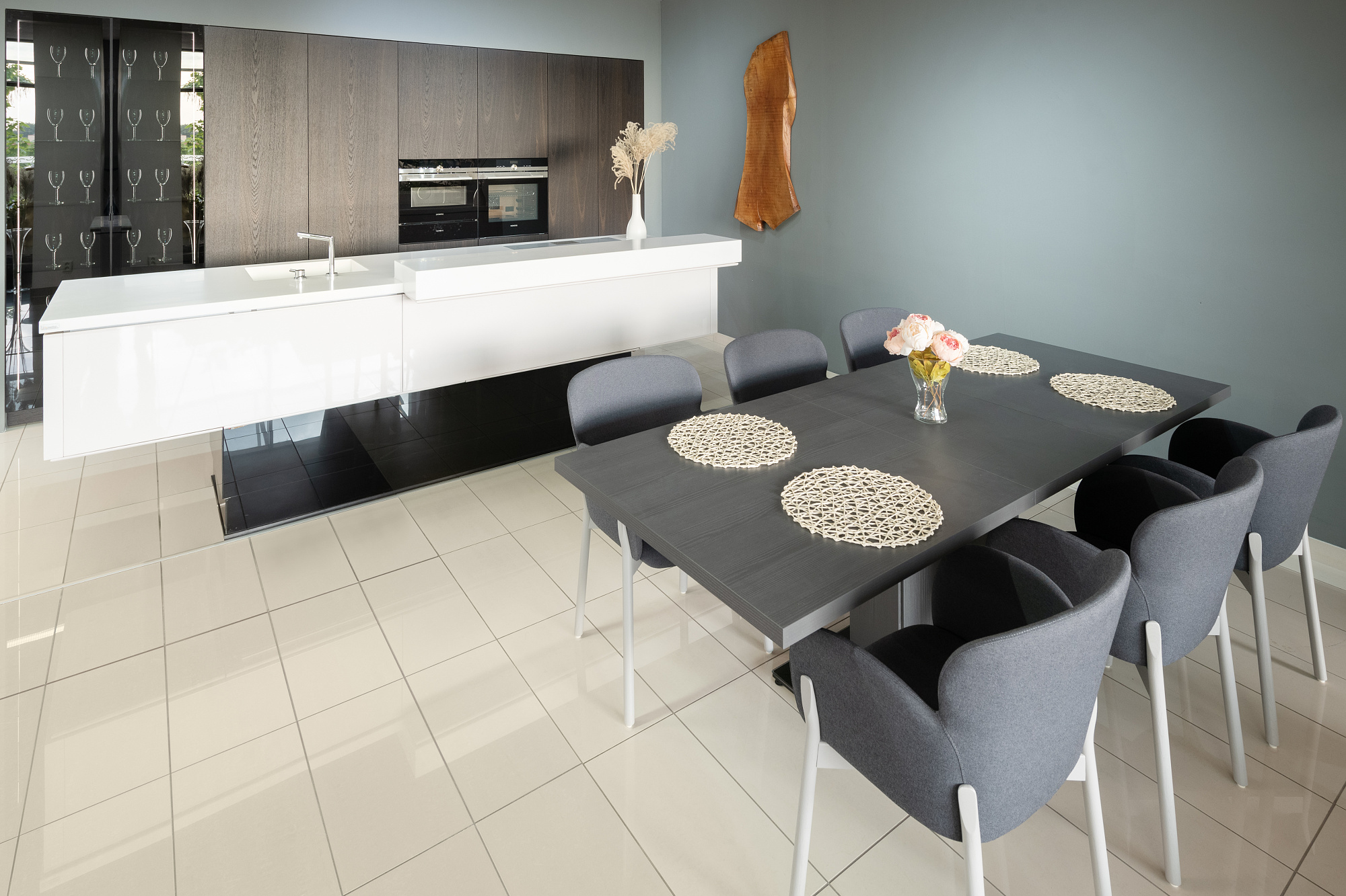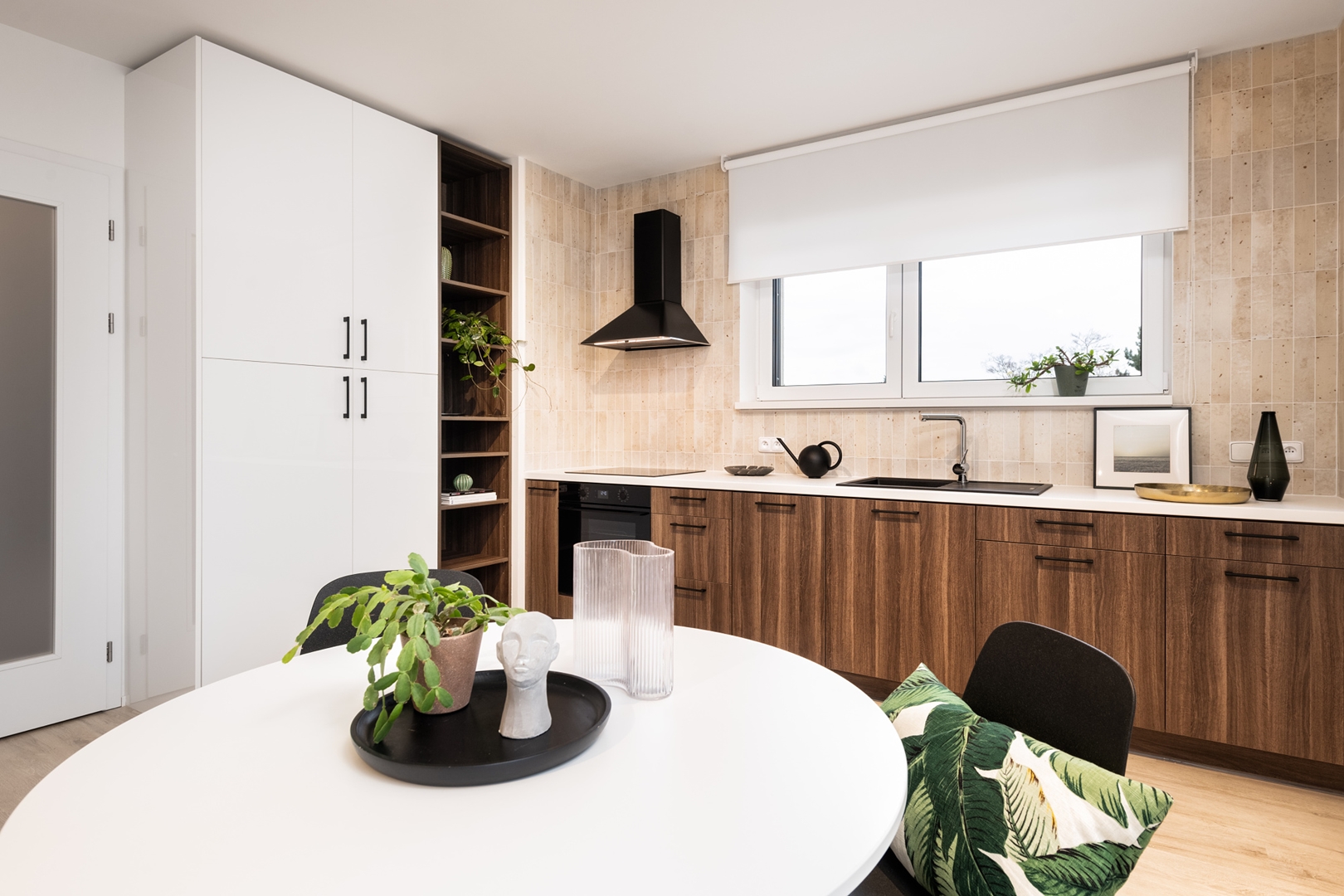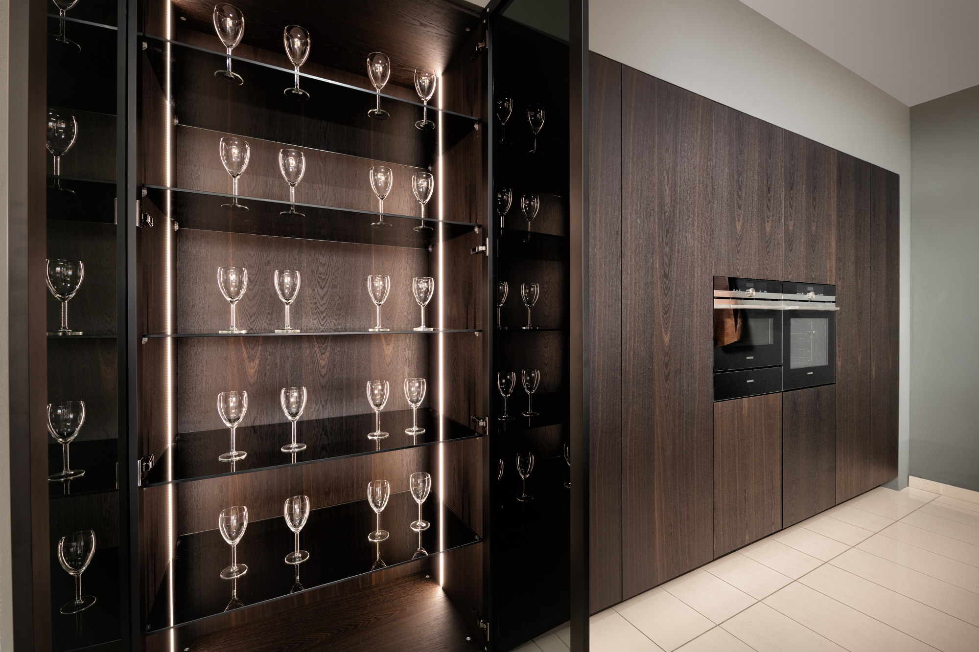 The chosen smoked oak veneer looks luxurious and timeless over the years. Used HETTICH EASYS opening system on built-in refrigerator. In combination with an adjustable washing and cooking center, the kitchen is practical and original.