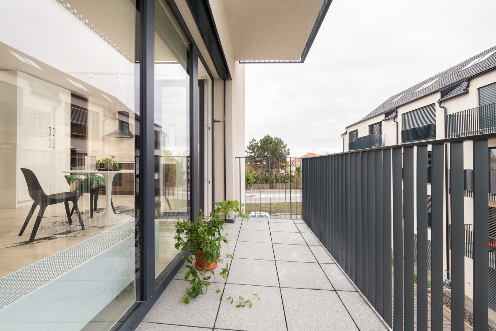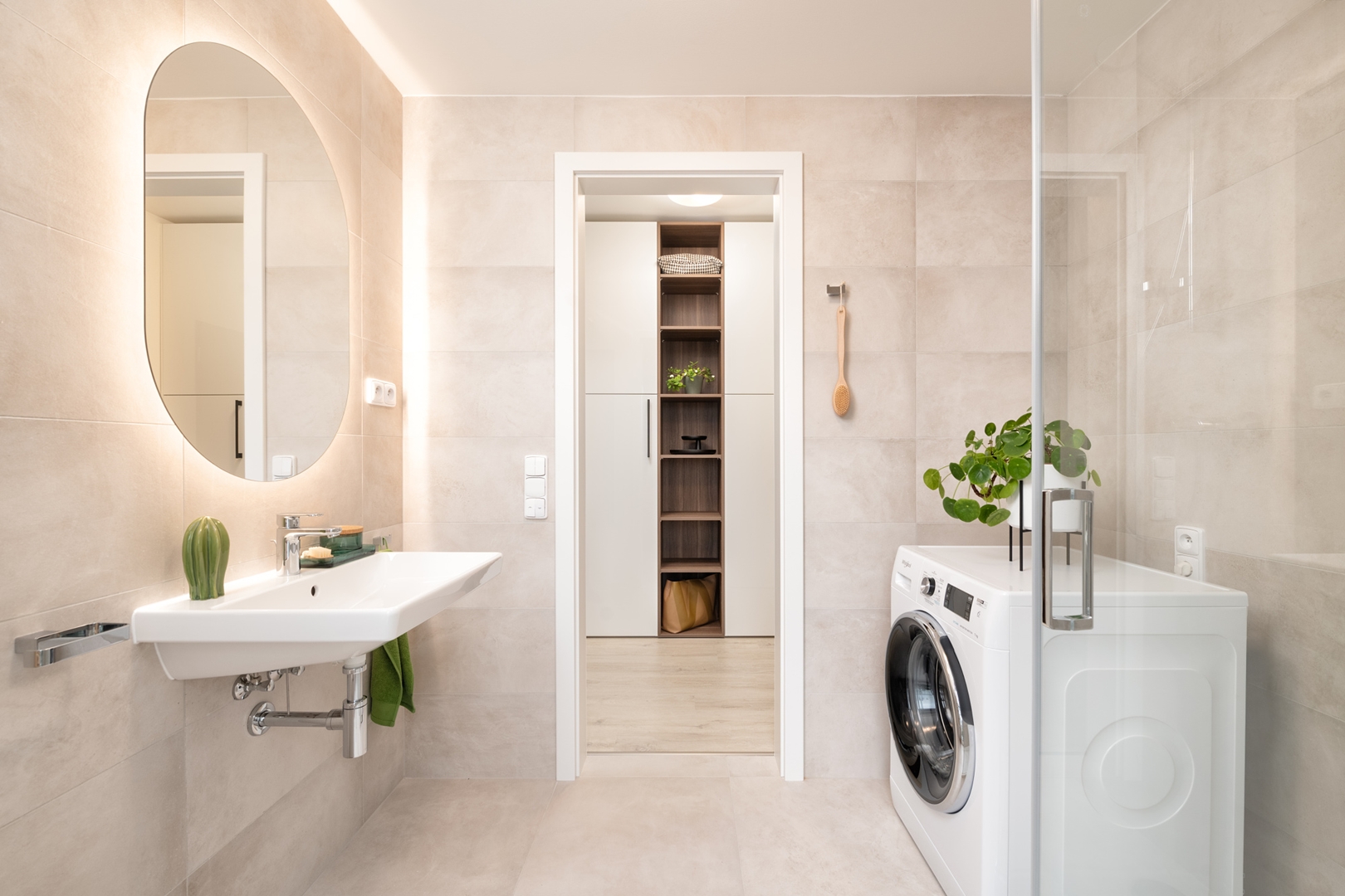 The realization of the apartment in Pohořelice included a kitchen made of laminate and Acrylic Gloss material, which is a panel covered with a glossy acrylic sheet, including household appliances. Then a wall in the living room, a lighted mirror and other built-in cabinets.