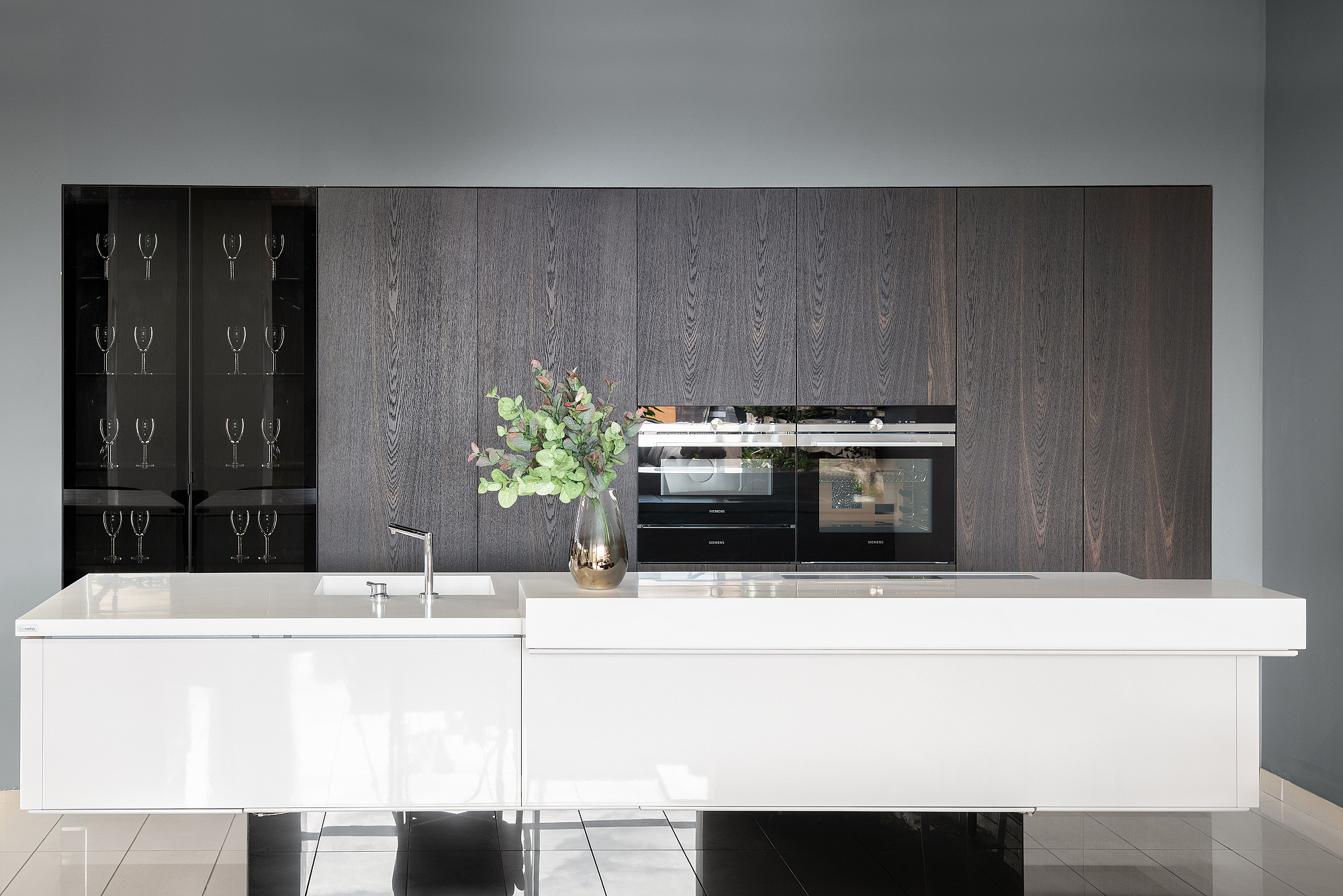 Le placage de chêne fumé choisi semble luxueux et intemporel au fil des années. Système d’ouverture HETTICH EASYS d’occasion sur réfrigérateur encastrable. En combinaison avec un centre de lavage et de cuisson réglable, la cuisine est pratique et originale.