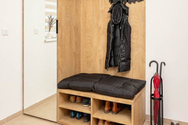 La porte blanche Fundermax assure une haute résistance et durabilité du matériau. Le décor agréable en bois de chêne classique ENDgrain se fond dans toute la maison.