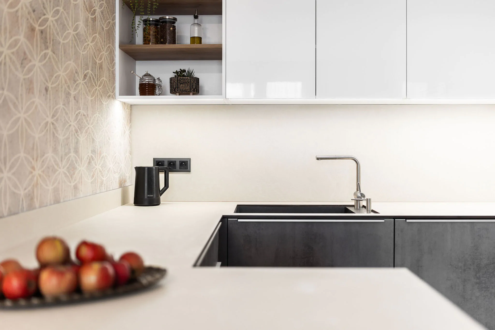 Kontrast bílých akrylátových ploch a tmavých spodních dvířek podtrhuje minimalistický charakter kuchyně a zároveň jí dodává výraz. Celým bytem se prolínají vkusně zvolené tapety a osvětlení, které interiér zjemňují a dělají ho útulným. Luxusní kompaktní pracovní deska v dekoru Luserna Bianco působí čistě a elegantně – a stejný motiv se promítá i do obývací části, takže prostor drží jednotnou linku.