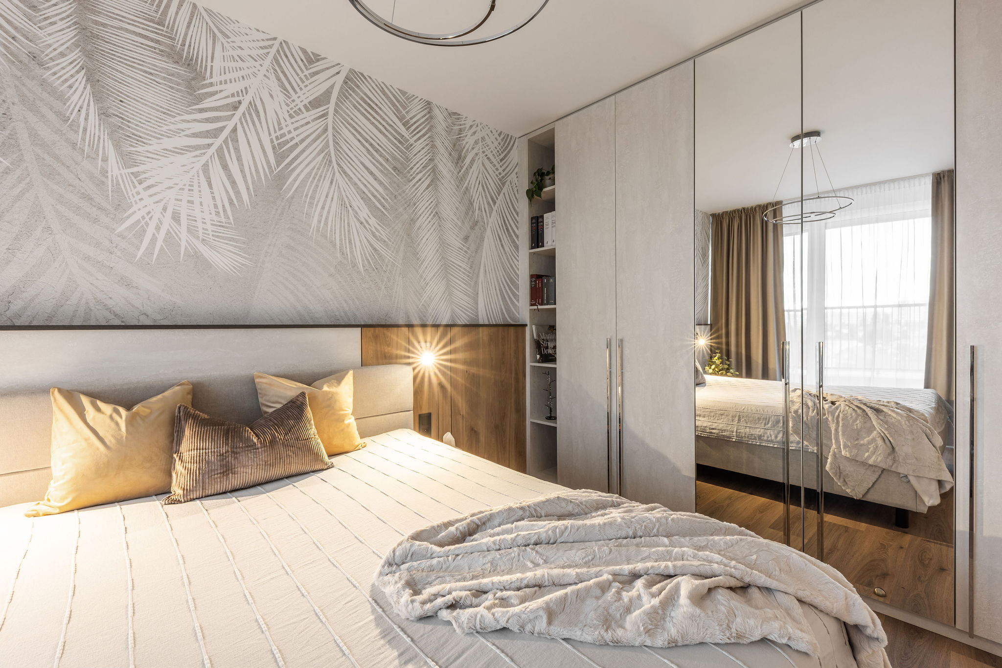 Součástí realizace byly také velké vestavné skříně v předsíni, technické místnosti, koupelně a v ložnici.