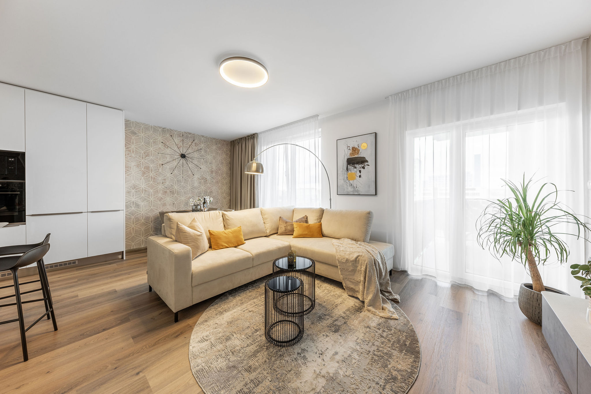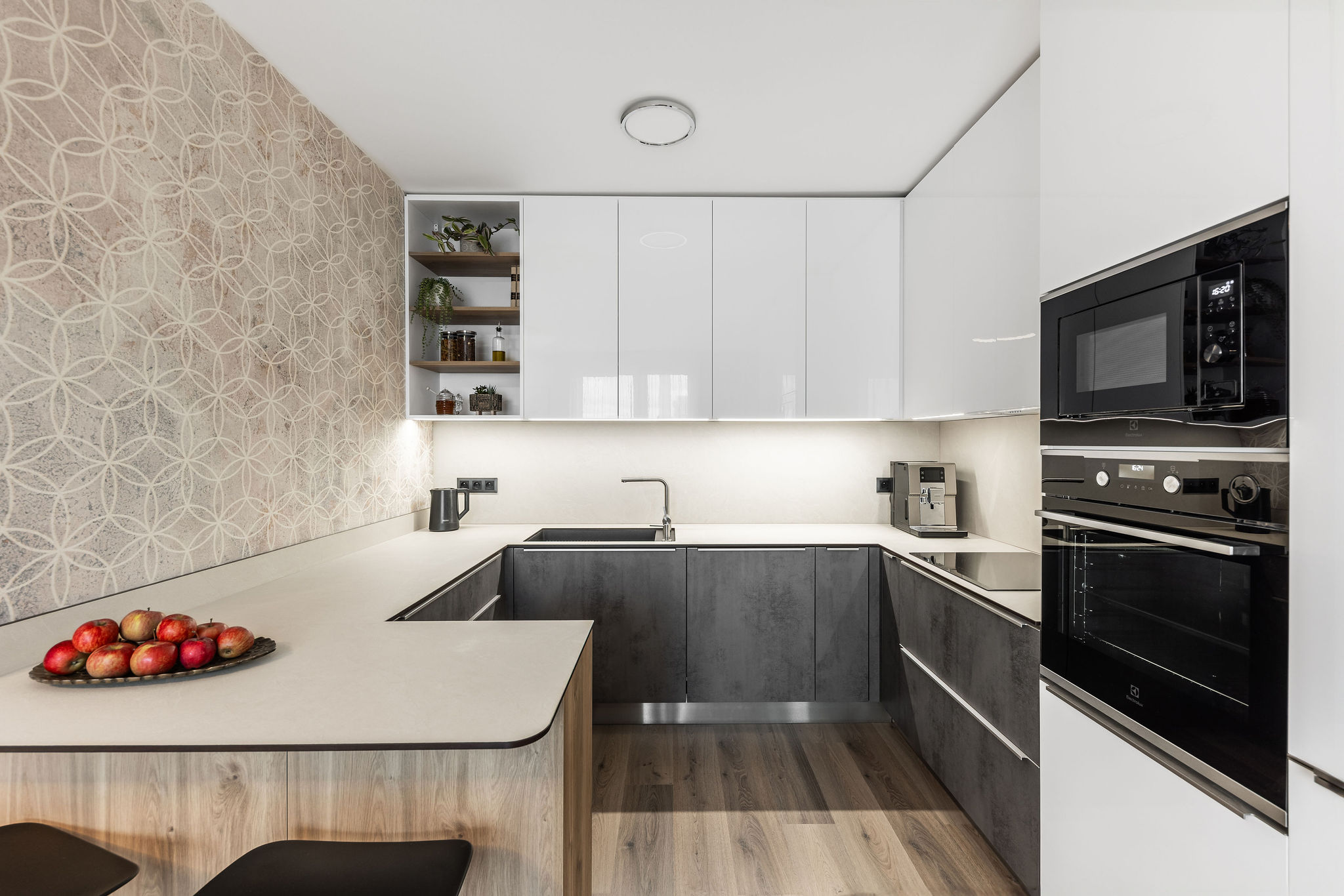 Kontrast bílých akrylátových ploch a tmavých spodních dvířek podtrhuje minimalistický charakter kuchyně a zároveň jí dodává výraz. Celým bytem se prolínají vkusně zvolené tapety a osvětlení, které interiér zjemňují a dělají ho útulným. Luxusní kompaktní pracovní deska v dekoru Luserna Bianco působí čistě a elegantně – a stejný motiv se promítá i do obývací části, takže prostor drží jednotnou linku.