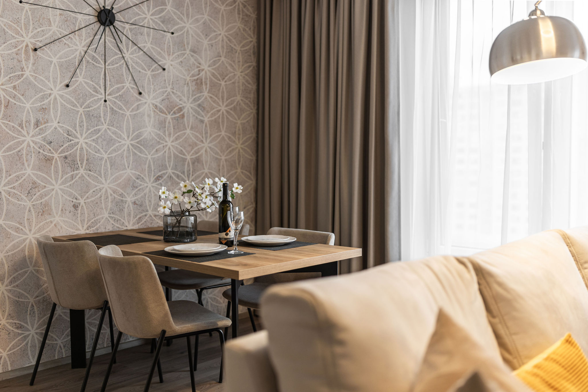Výsledkem je harmonický celek: kuchyně plynule přechází do obývací části, pracuje s jednotným dekorem dřeva a tmavými akcenty, a celý byt díky tomu působí promyšleně, moderně a nadčasově. Designérka skvěle využila každý volný prostor v tomto bytě tak, aby byl funkční a smysluplný. Otevřené police s dekoracemi dodávají prostoru „domov“, ale stále drží střídmý a prémiový vzhled.