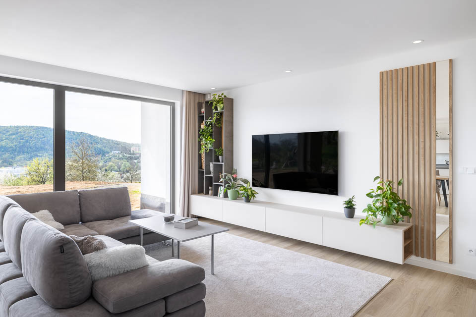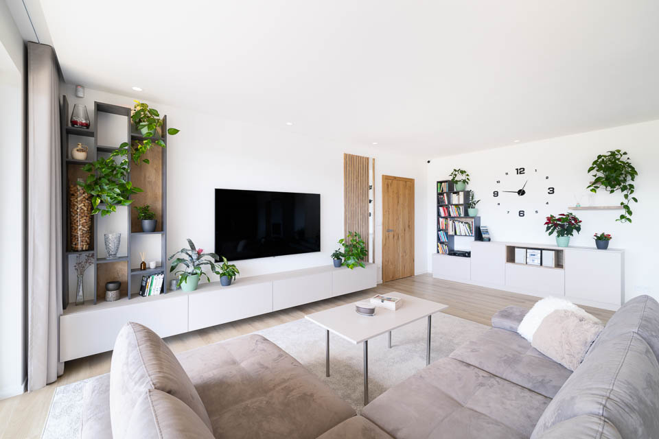 Obývací pokoj v moderním designu díky jednoduchým a čistým liniím. Společně s klienty jsme vytvořili prostředí, ve kterém se cítí pohodlně a dobře organizovaní.