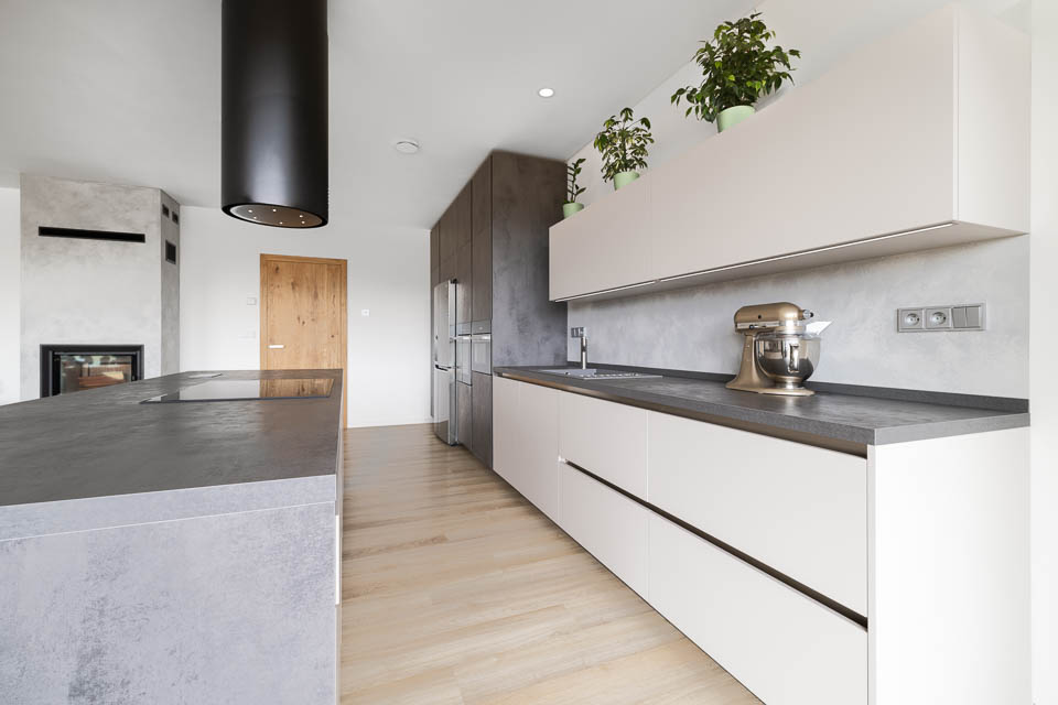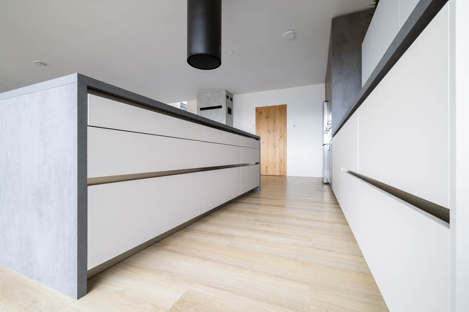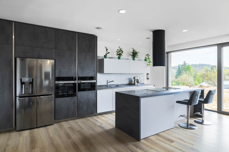 Středobodem interiéru je kuchyně v neutrálních barvách tmavého betonu a šedého kašmíru. Dobře vybavená kuchyně s moderním a funkčním nábytkem je základem pro pohodlné vaření. Velké vestavěné skříně zajistí dostatečné množství skladovacích prostor a stále zůstávají esteticky přitažlivé. Nezbytnou součástí jsou inteligentní kuchyňské spotřebiče Zvolené dekory se opakují napříč celým domem a vytváří jednotný design.