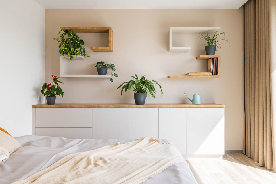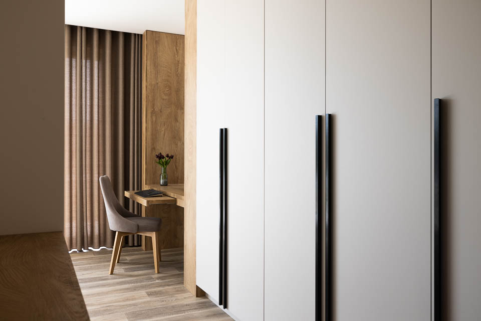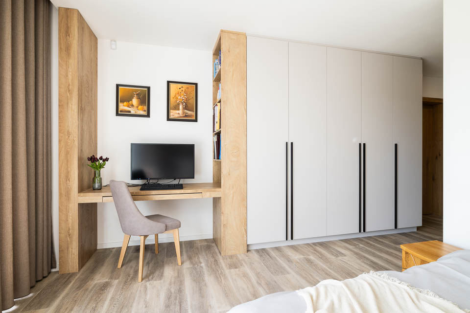 Součástí realizace je velké množství skříňového nábytku. Když jsme přemýšleli nad vybavením ložnice, mysleli jsme na přání klientky a vytvořili malý pracovní koutek.