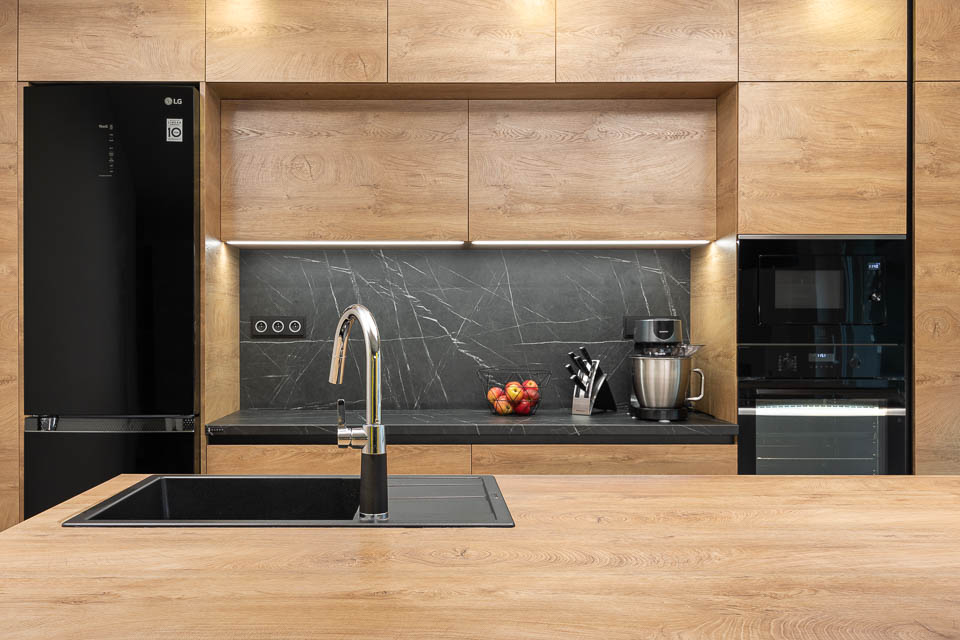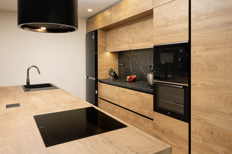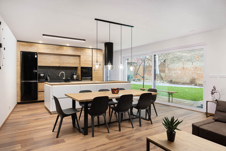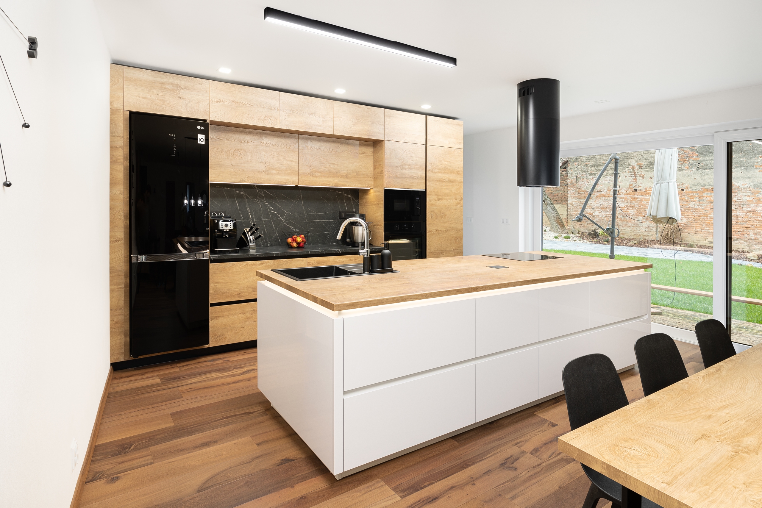 Velká realizace od předsíně, přes kuchyni a obývák až do koupelny. Vše v jednom stylu, pohodlně z jednoho místa. Středem domácnosti je jednoznačně velká, moderní kuchyně s bílými dvířky Fundermax, která zajistí vysokou odolnost a stálost materiálu. Příjemný dřevodekor dub ENDgrain klasik se prolíná celým domem.