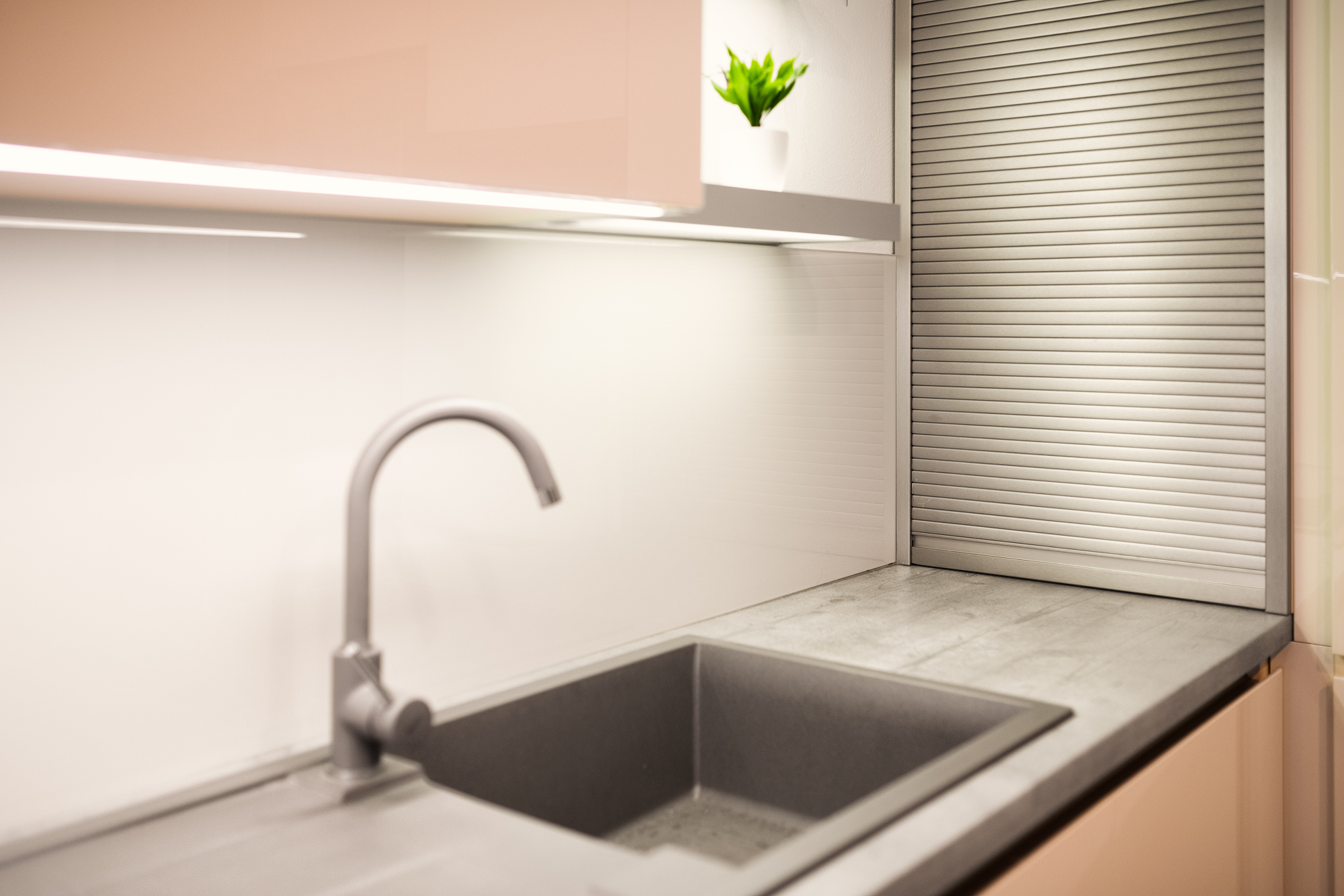 Luxusní lakovaná kuchyně ve smetanovém odstínu s pracovní deskou imitace betonu a lesklým obkladovým sklem. Pěknými detaily jsou světelné police, skrytá zásuvka v ostrůvku nebo praktický roletový systém v nerezovém provedení. K pracovní desce krásně ladí granitový dřez barvy aluminium s baterií ve stejném odstínu.