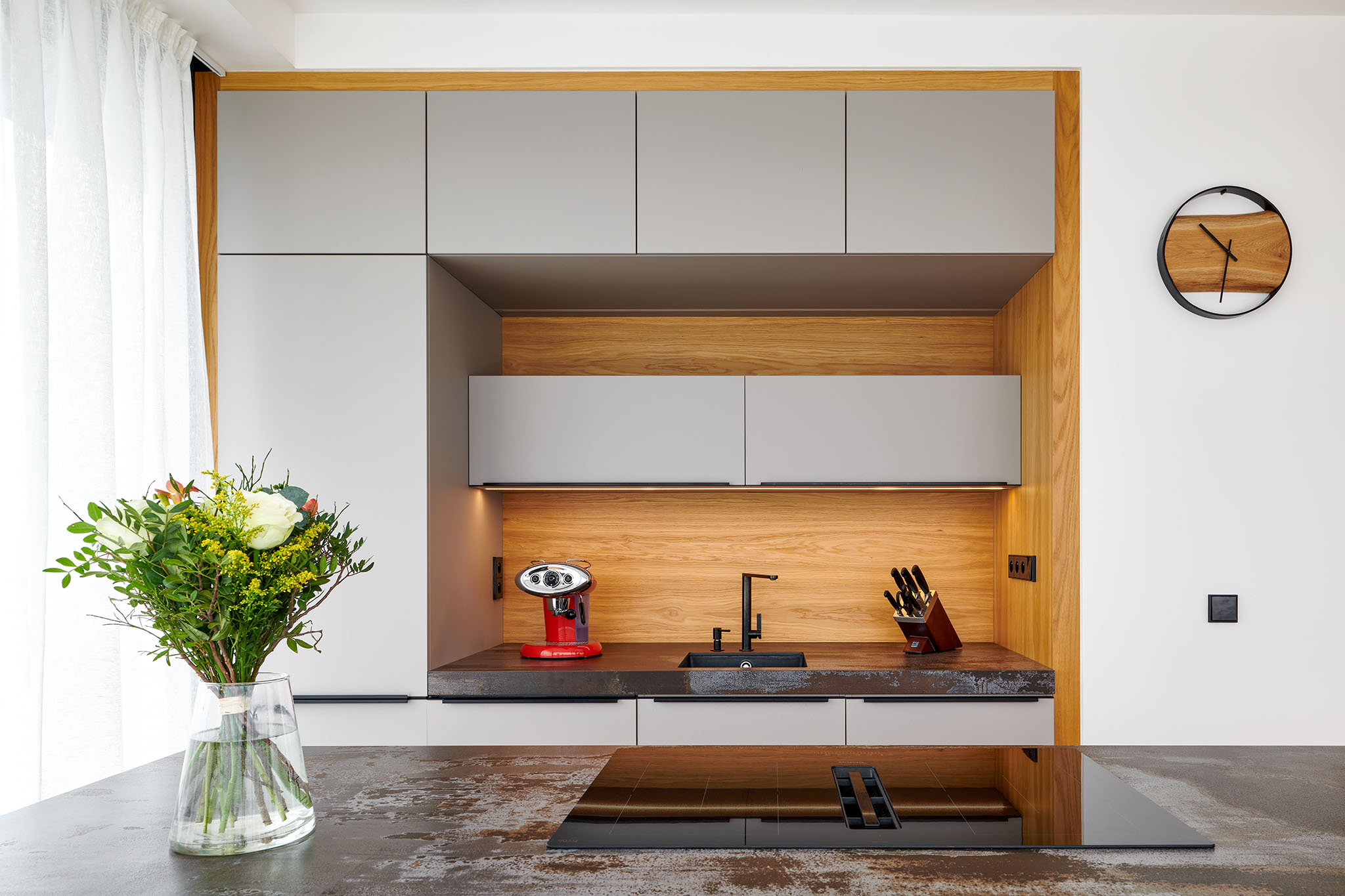 Realizovali jsme nábytek pro našeho obchodního partnera INTERIÉRY VEGA. Tato realizace ukazuje, jak lze propojit moderní design s funkčností a přírodními materiály. Kuchyně má laminátová dvířka bez úchytek, která jsou nejen estetická, ale i odolná a snadno udržovatelná. Kombinace béžové barvy s dýhovanými prvky dodává prostoru eleganci a teplo, zatímco kamenná pracovní deska přináší luxusní a nadčasový prvek.