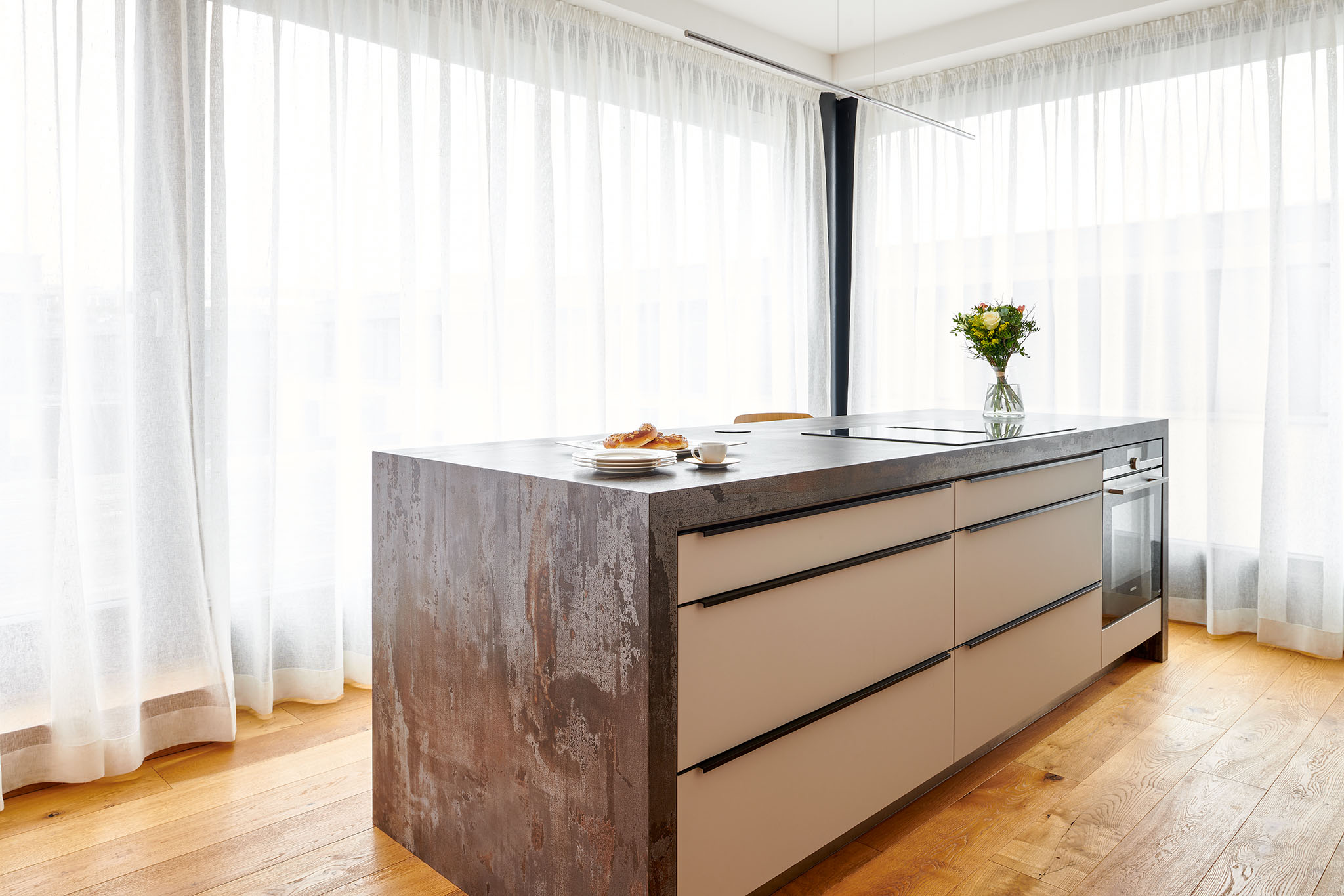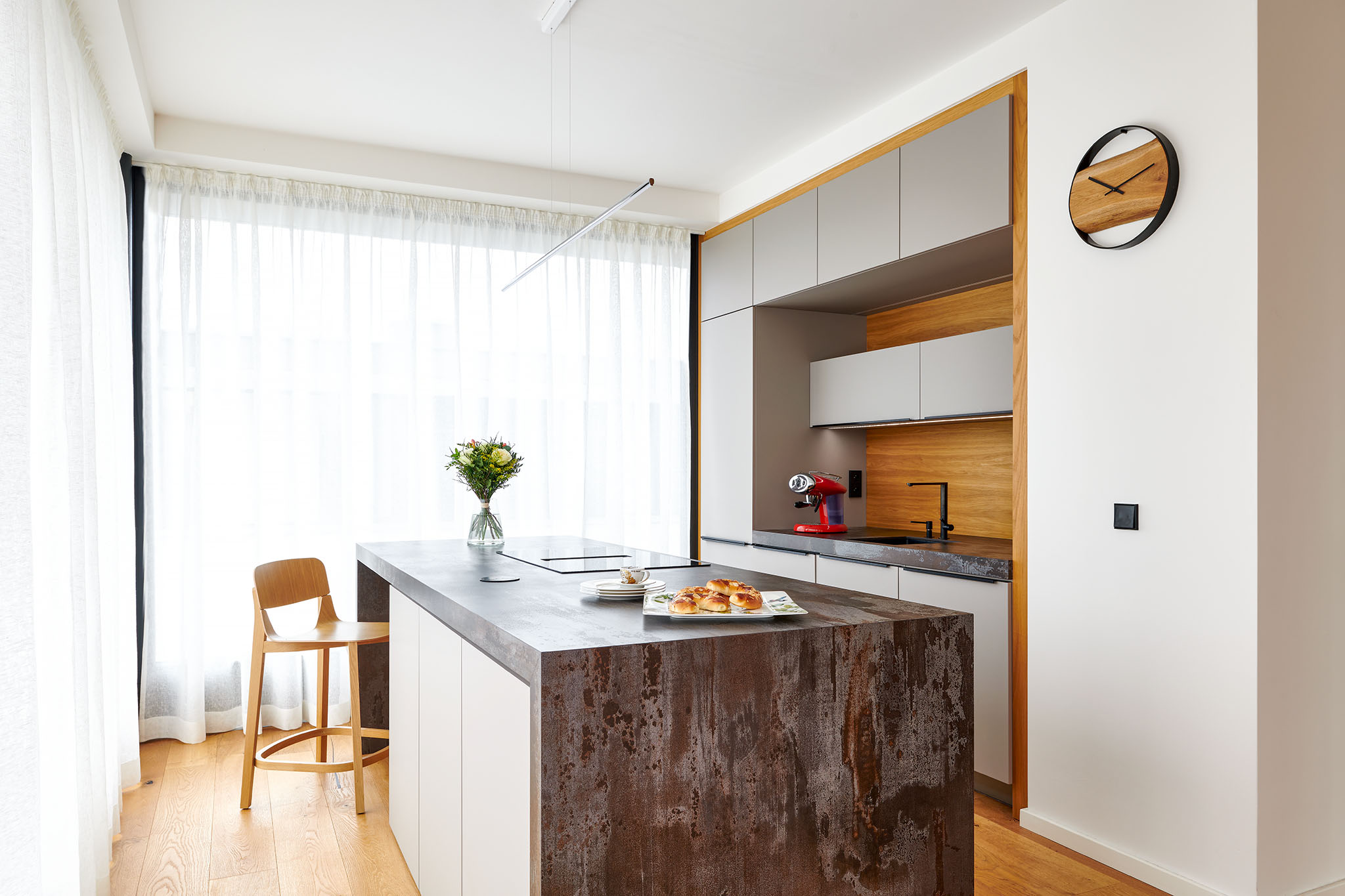 Centrálním bodem kuchyně je ostrůvek, který poskytuje dostatek pracovní plochy i úložného prostoru a zároveň slouží i k malému sezení.
