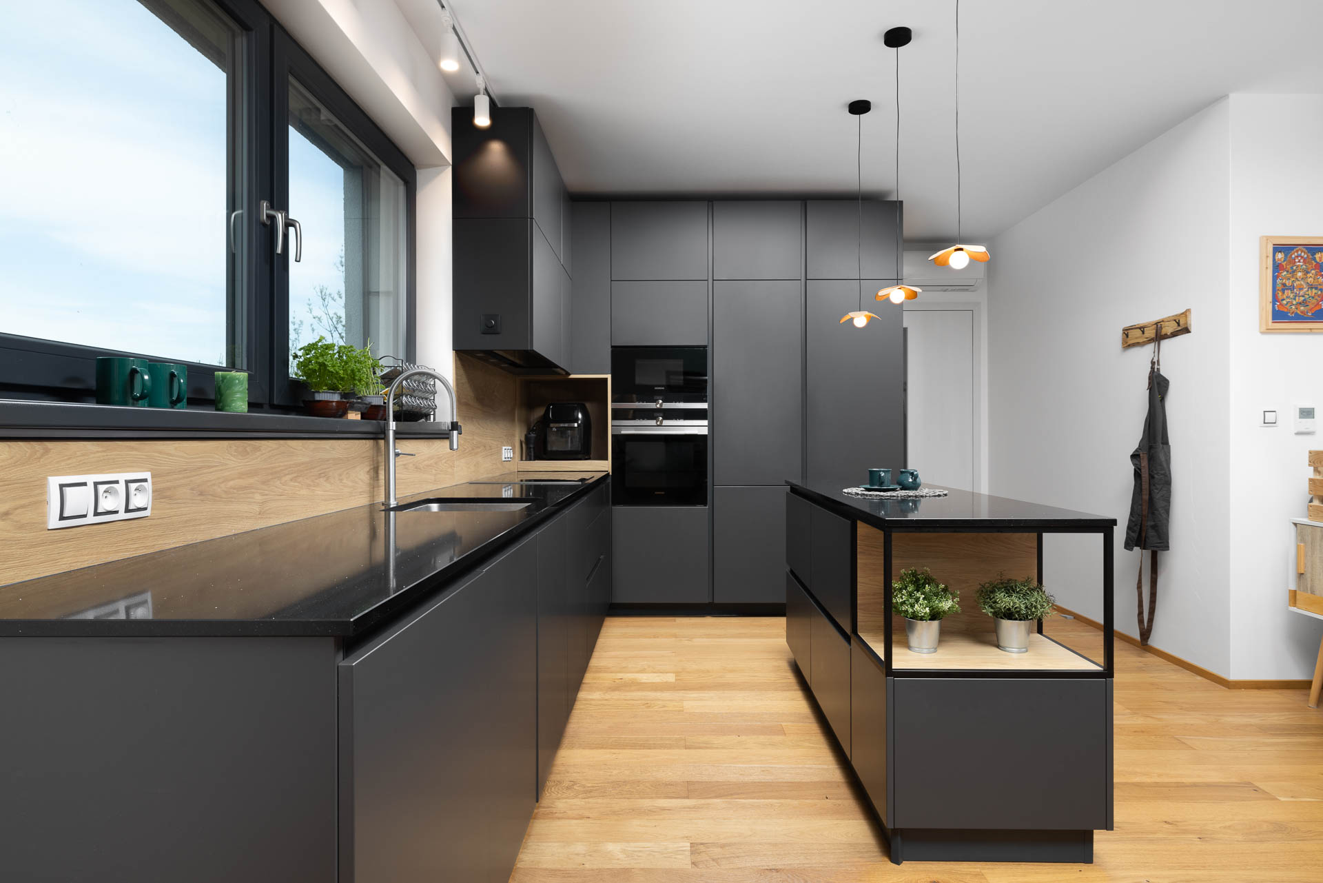 Oslovuje moderním designem s tmavým supermatem a designovými hliníkovými prvky, které dodávají prostoru na originalitě a luxusu. Kombinace těchto materiálů vytváří sofistikovanou a elegantní atmosféru.