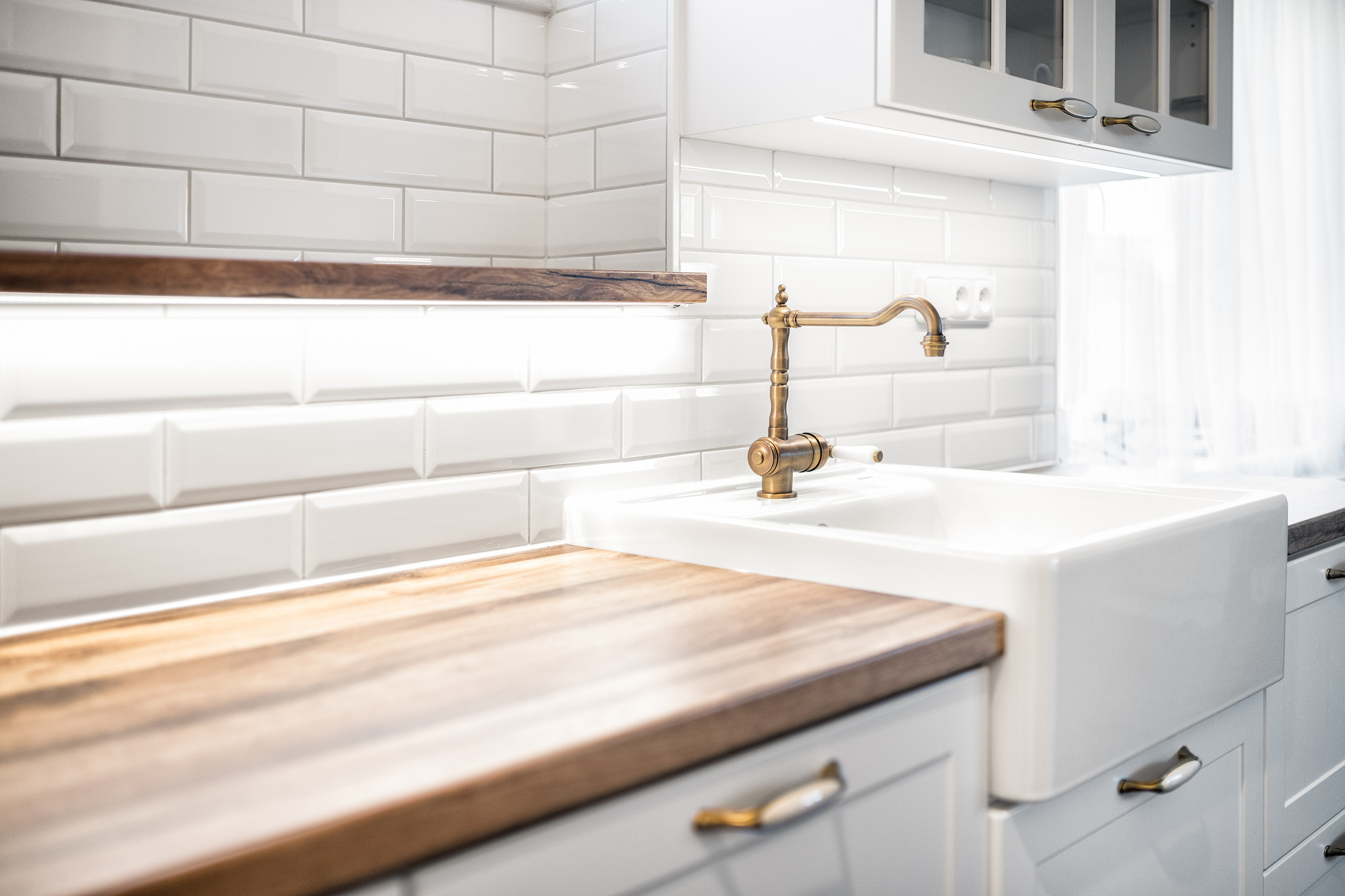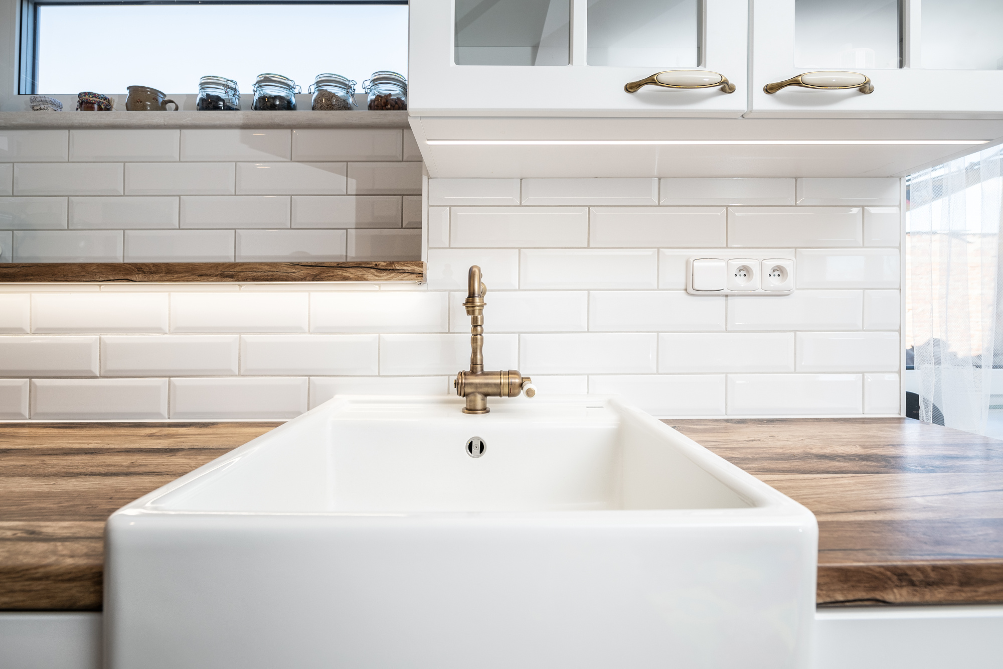 Vkusně zvolený keramický dřez v zářivě bílé barvě, s montáží na pracovní desku.