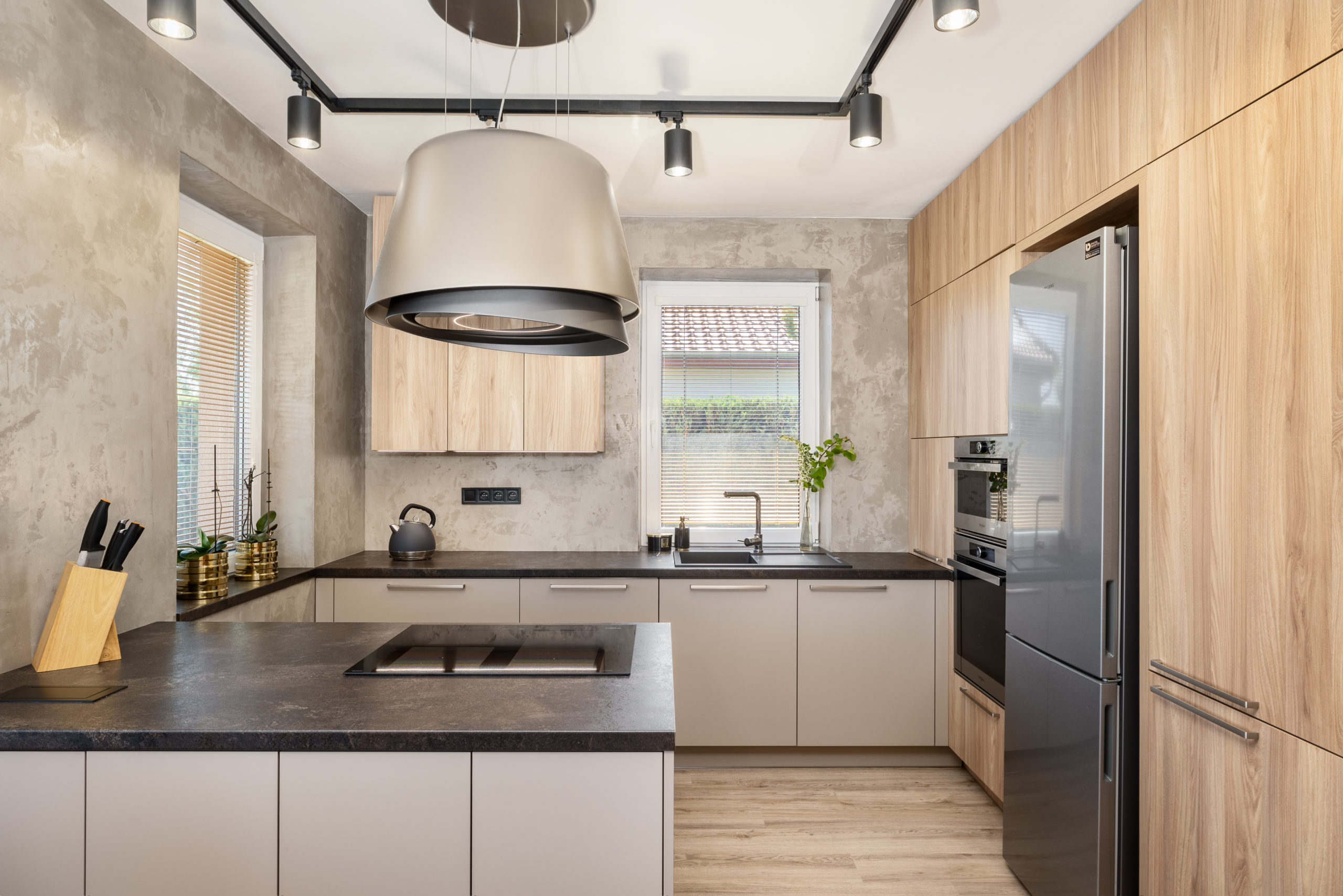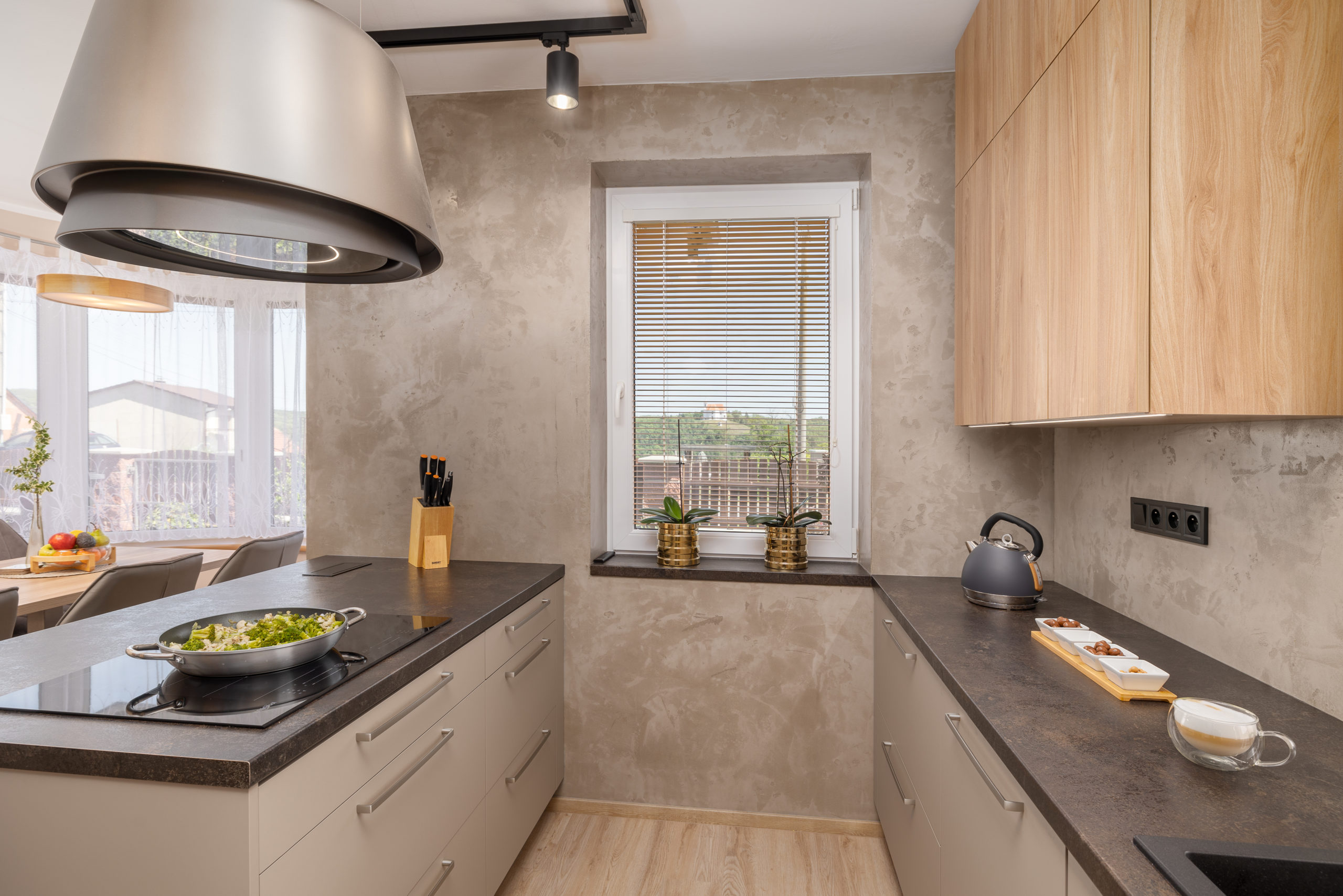 K předem plánované betonové stěrce na stěnách se dokonale hodí pracovní deska v antracitovém odstínu. Kuchyně je doplněná o dřevodekor Jilm natur, který vnáší do kuchyně nádech přírody a udržuje příjemnou, útulnou atmosféru.