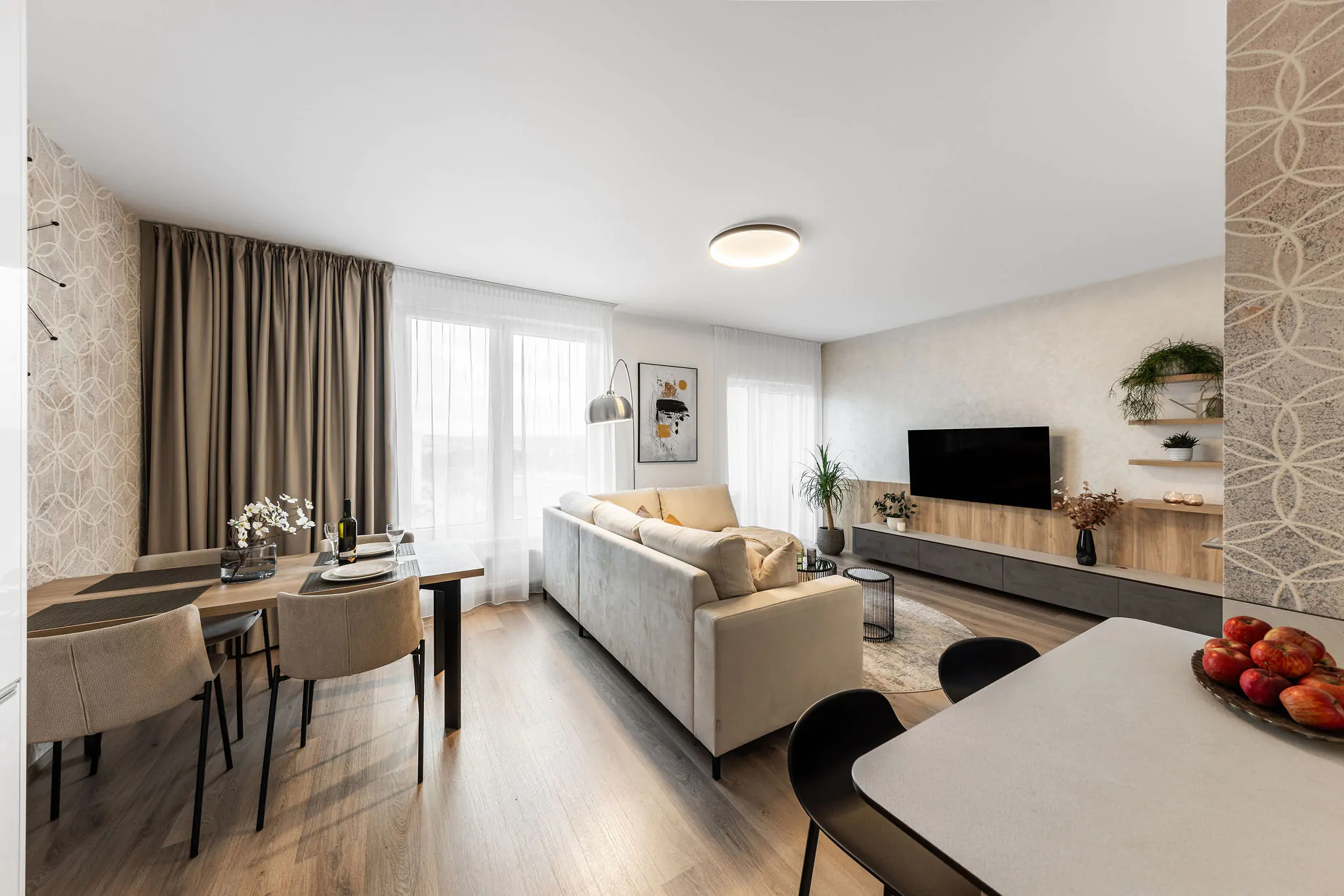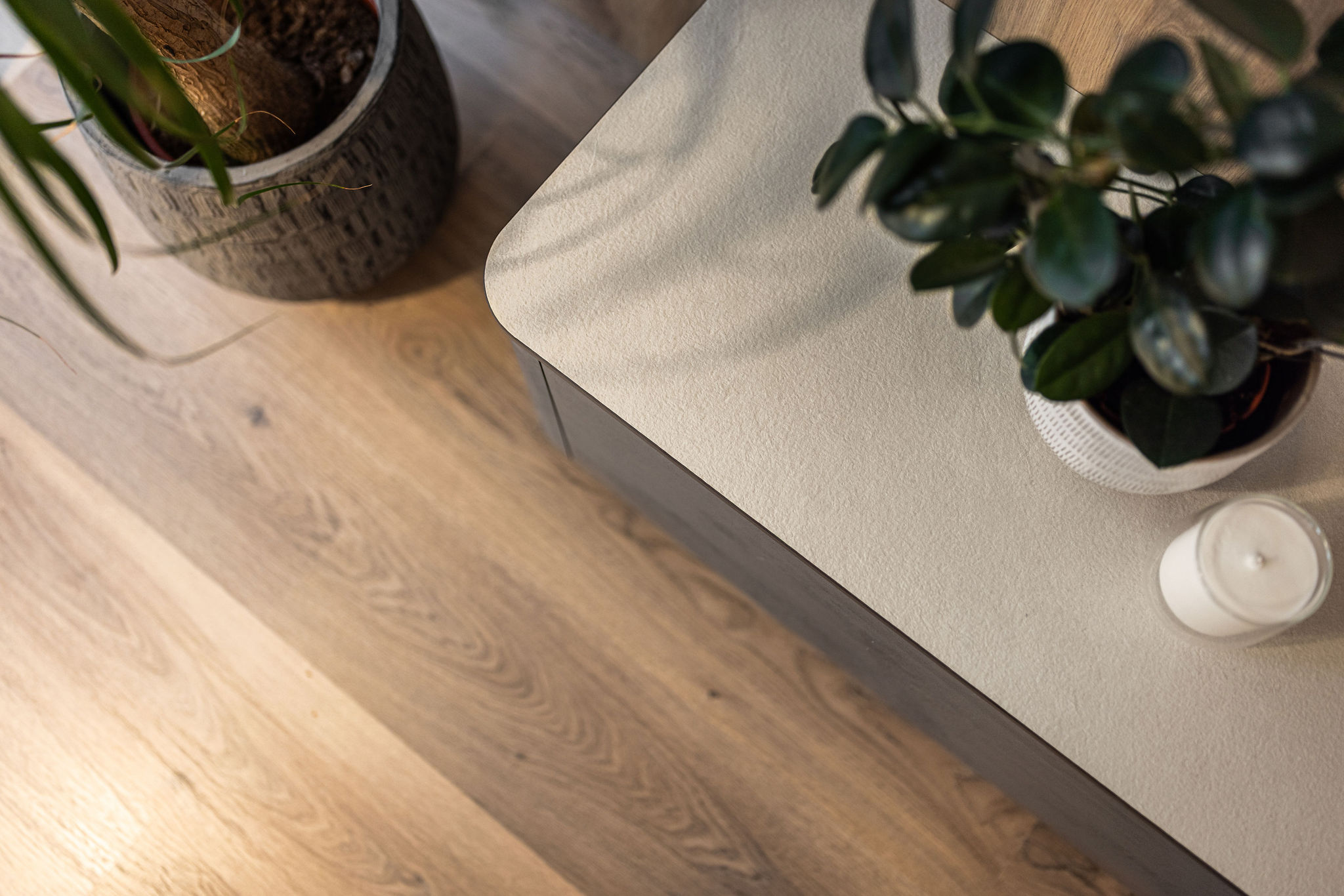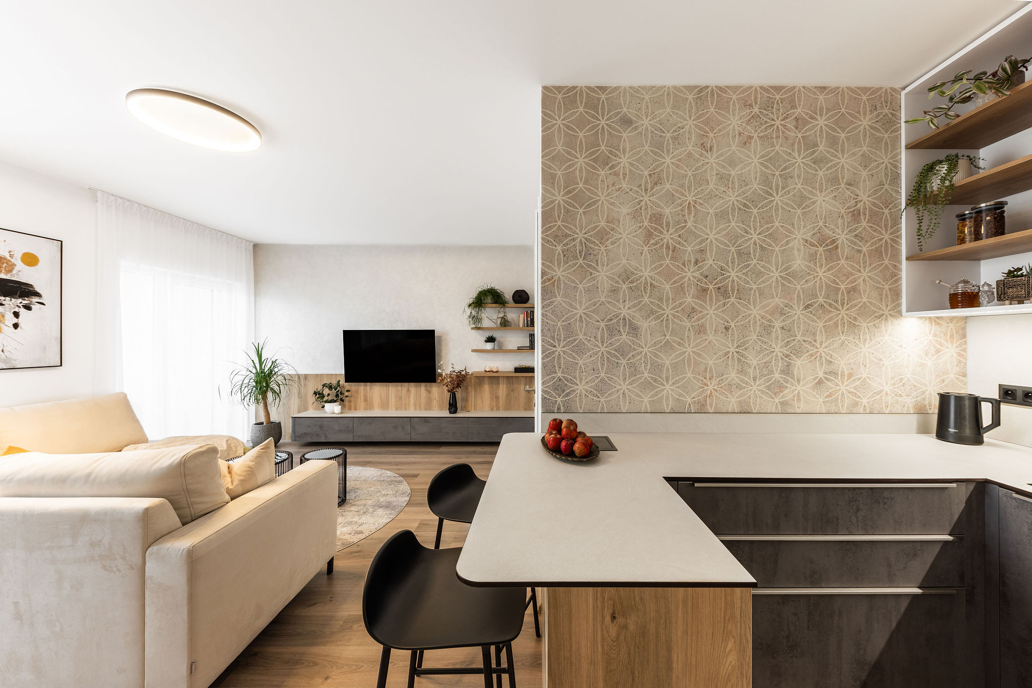 Obývací pokoj je součástí realizace pro interiérovou designérku Pavlínu Štěpánkovou a plynule navazuje na kuchyni ACRYLIC | LUSERNA. Má stejný rukopis – čisté linie, jednotné dekory a tmavé akcenty, které prostoru dodávají hloubku. Nábytek byl navržen tak, aby působil lehce, ale zároveň nabídl maximum úložného prostoru. Praktické police dávají prostor dekoracím, ale interiér zůstává střídmý, elegantní a nadčasový.