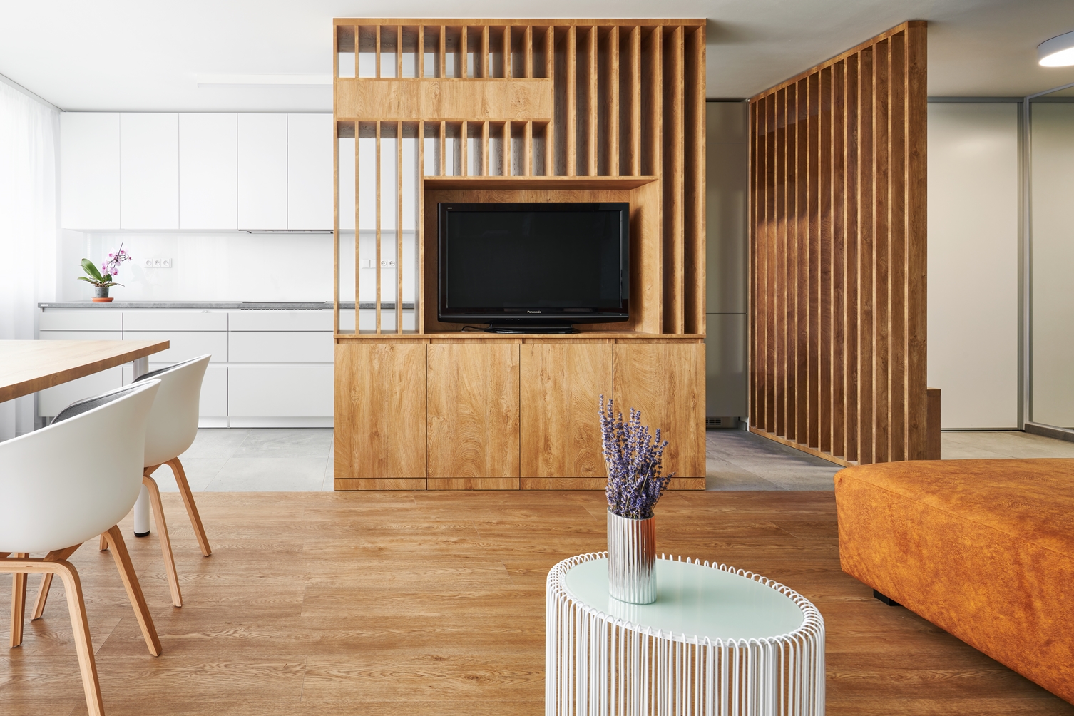 Skříně ve všech místnostech, stěny obložené dřevem, ale také postel. To vše bylo součástí tohoto interiéru, který jsme realizovali. Klient tak řešil vybavení svého bytu z jednoho místa a bez starostí.