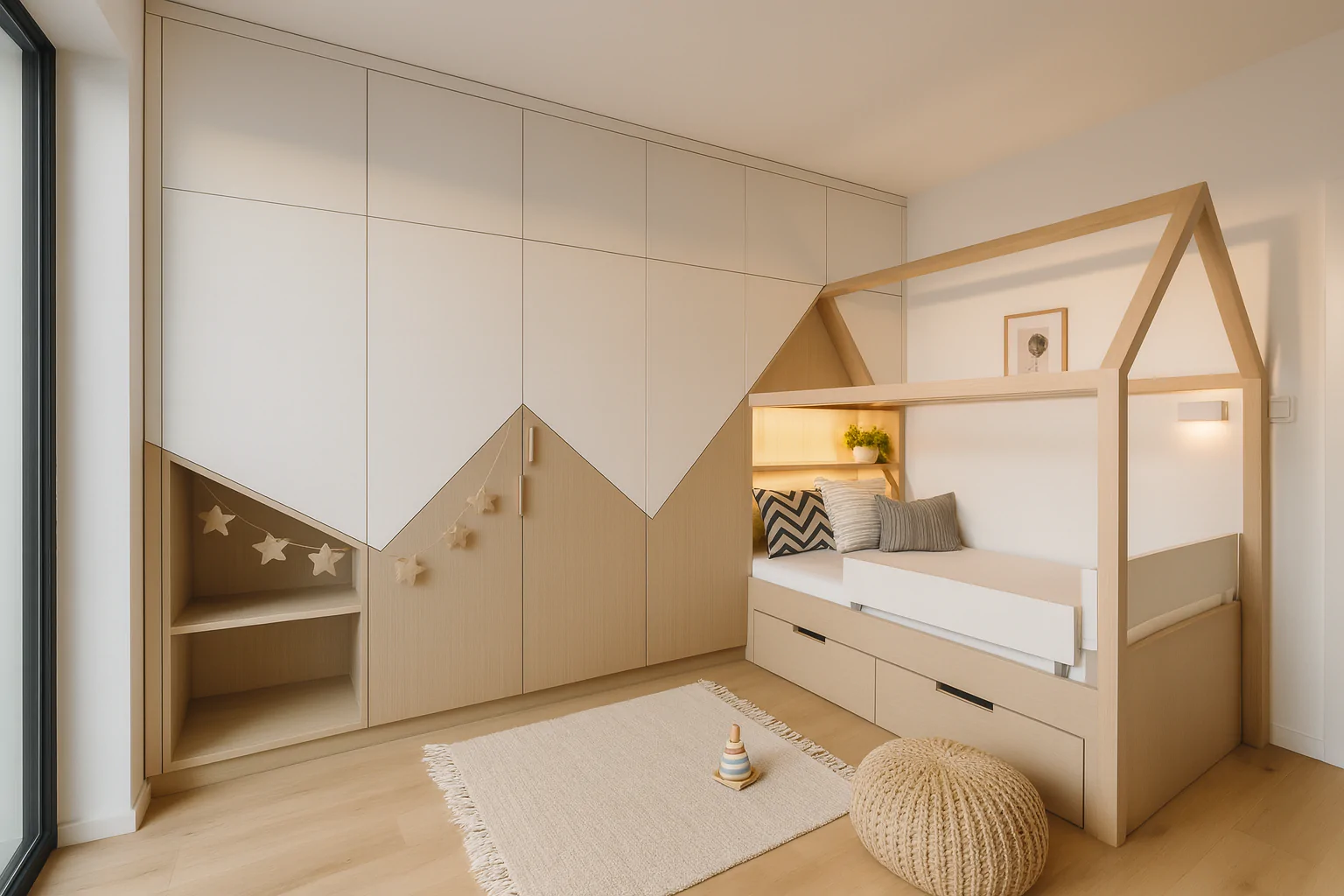 Dětské pokoje navrhujeme tak, aby rostly s dítětem: bezpečně, odolně a chytře uspořádané. Pracujeme s širokou škálou materiálů – vždy s důrazem na snadnou údržbu, odolné hrany a neškodné povrchové úpravy.