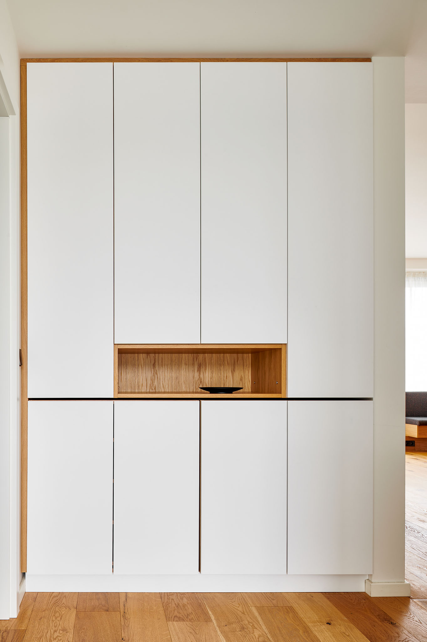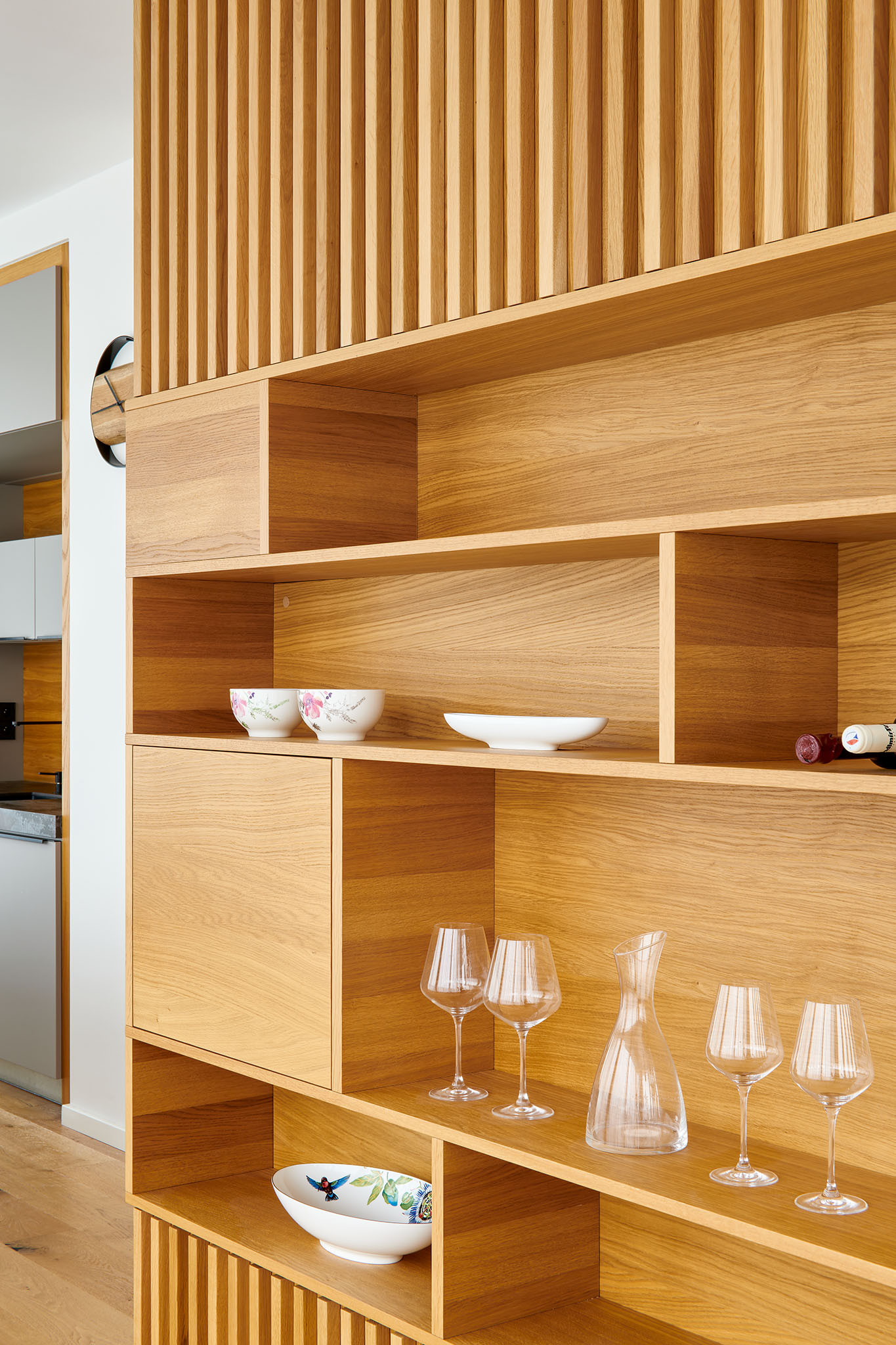 Tento interiér jsme vyrobili u nás v ořechovské dílně pro našeho obchodního partnera INTERIÉRY VEGA. V obývacím pokoji dominuje dýhovaná knihovna s vertikálními lamelami, která funguje jako tichý akcent i praktické úložiště. Otevřené niky zvýrazní dekor, skryté skříňky udrží pořádek – čisté linie a přesné lícování dávají prostoru klid a řád.