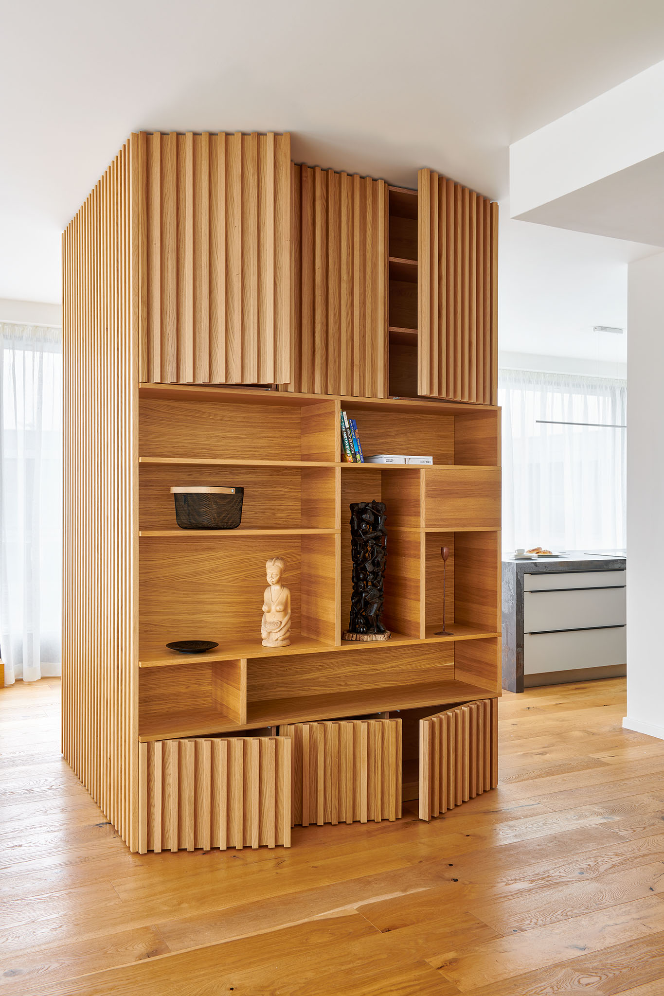 Dýhovaná knihovna s lamelami, šedý pracovní kout, bílá vestavba do předsíně a šatna na míru. Klidný design, chytré úložiště. Projekt byl realizován ve spolupráci s obchodním partnerem INTERIÉRY VEGA, Hanusova 1537, 140 00 Praha 4.