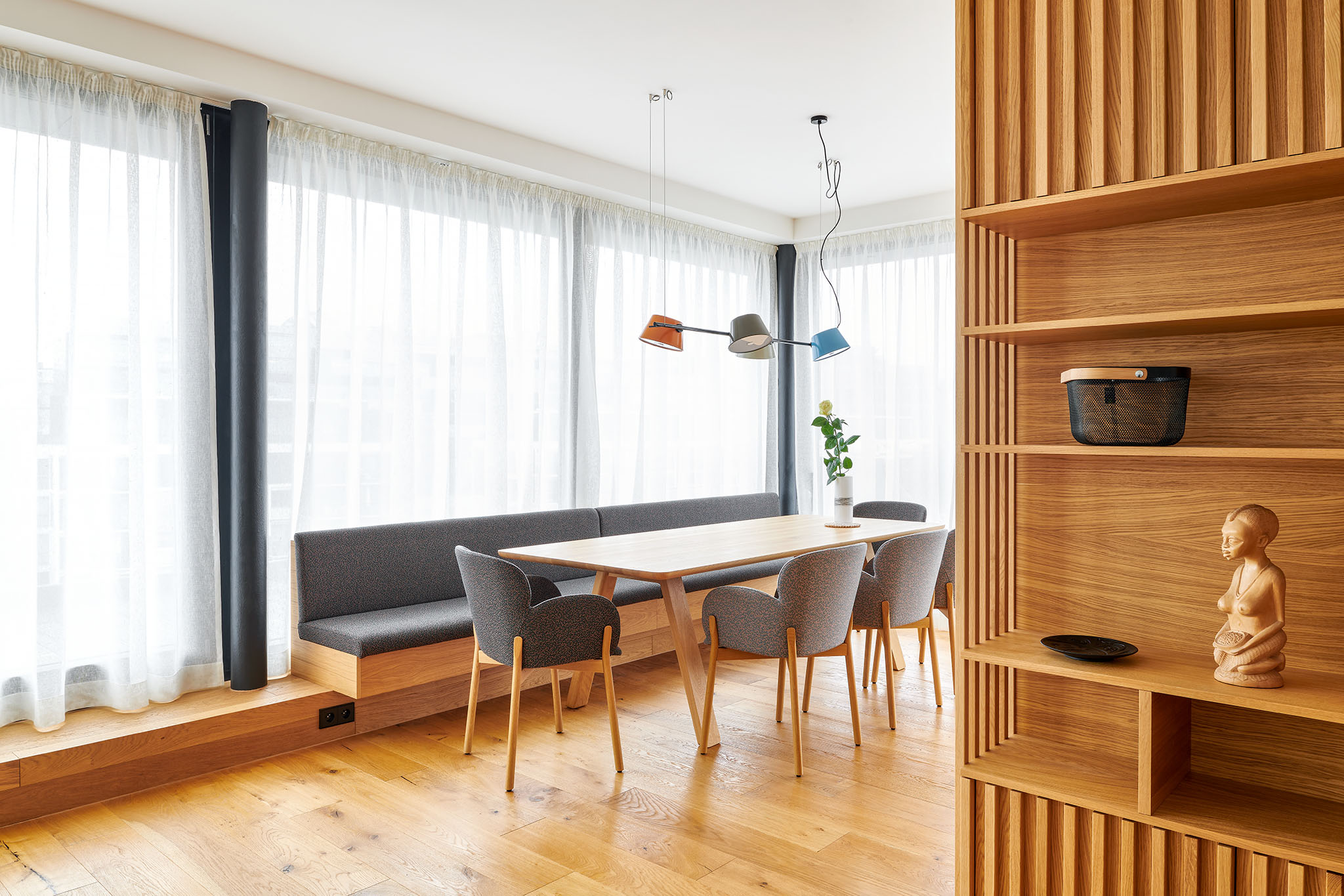 U vstupu do bytu jsme realizovali bílou vestavěnu skříň s dubuvou nikou, která působí elegantně a schová vše, co je potřeba. Na pracovní místa byly navrženy šedé kouty s kompaktním stolem, horními skříňkami v dřevodekoru a policí pro denní drobnosti. Šatní skříň s posuvnými dveřmi šetří místo a zajišťuje rychlý přístup k uschovaným věcem. Kvalitní kování zajistí hladký a tichý chod. Kombinace matné šedé a dřeva působí elegantně přes den i večer. V rámci tohoto projektu jsme vyrobili a malou otevřenou šatnu.