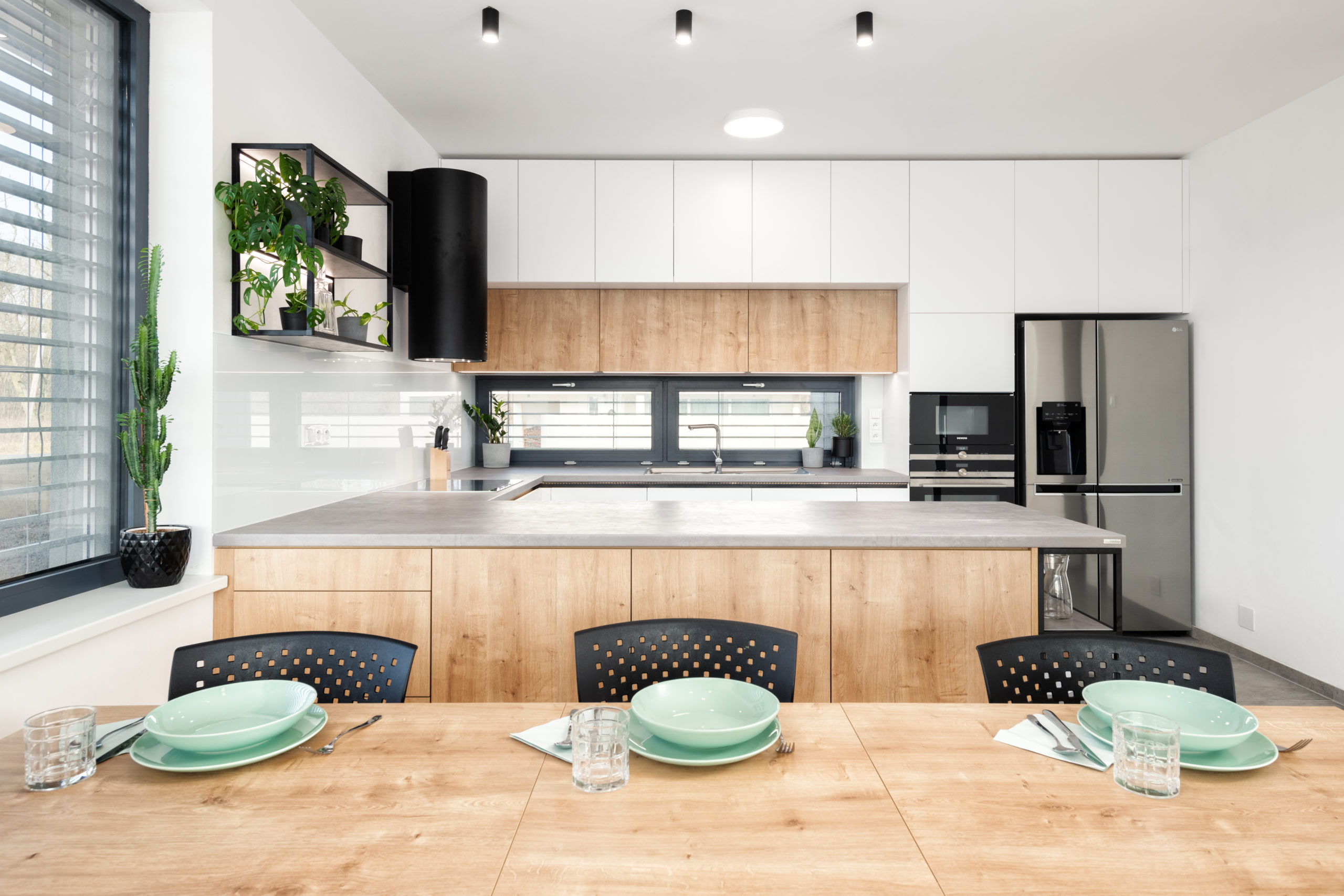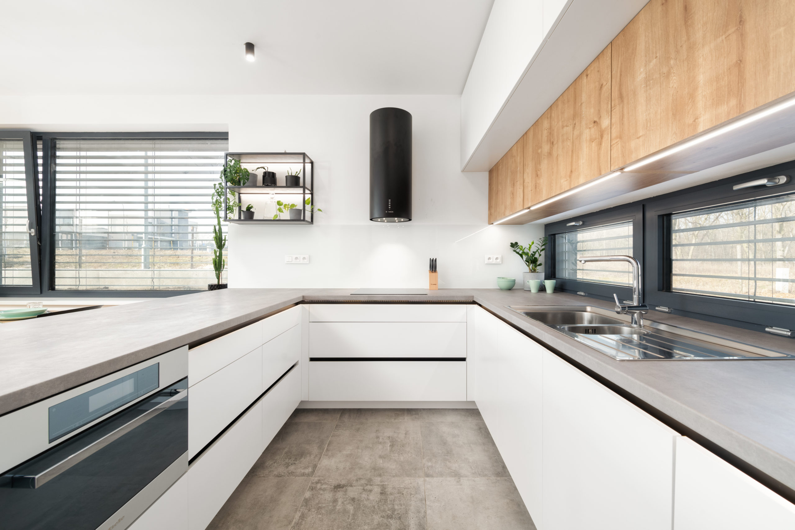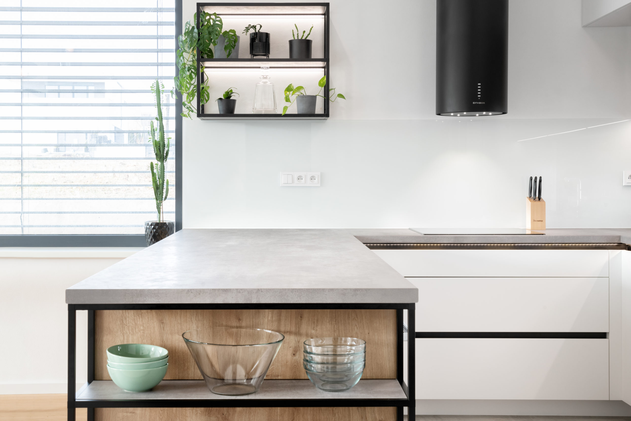 K výraznému kontrastu přispívá použití tmavého lamina v dekoru beton – tento materiál dodává kuchyni moderní, lehce industriální nádech a skvěle ladí s ostatními prvky. Elegantní tmavé sklo v černém rámu propouští jemné kontury nádobí a dekorací, čímž opticky odlehčuje horní řadu skříněk. Působí vzdušně, moderně a uklidňujícím dojmem.