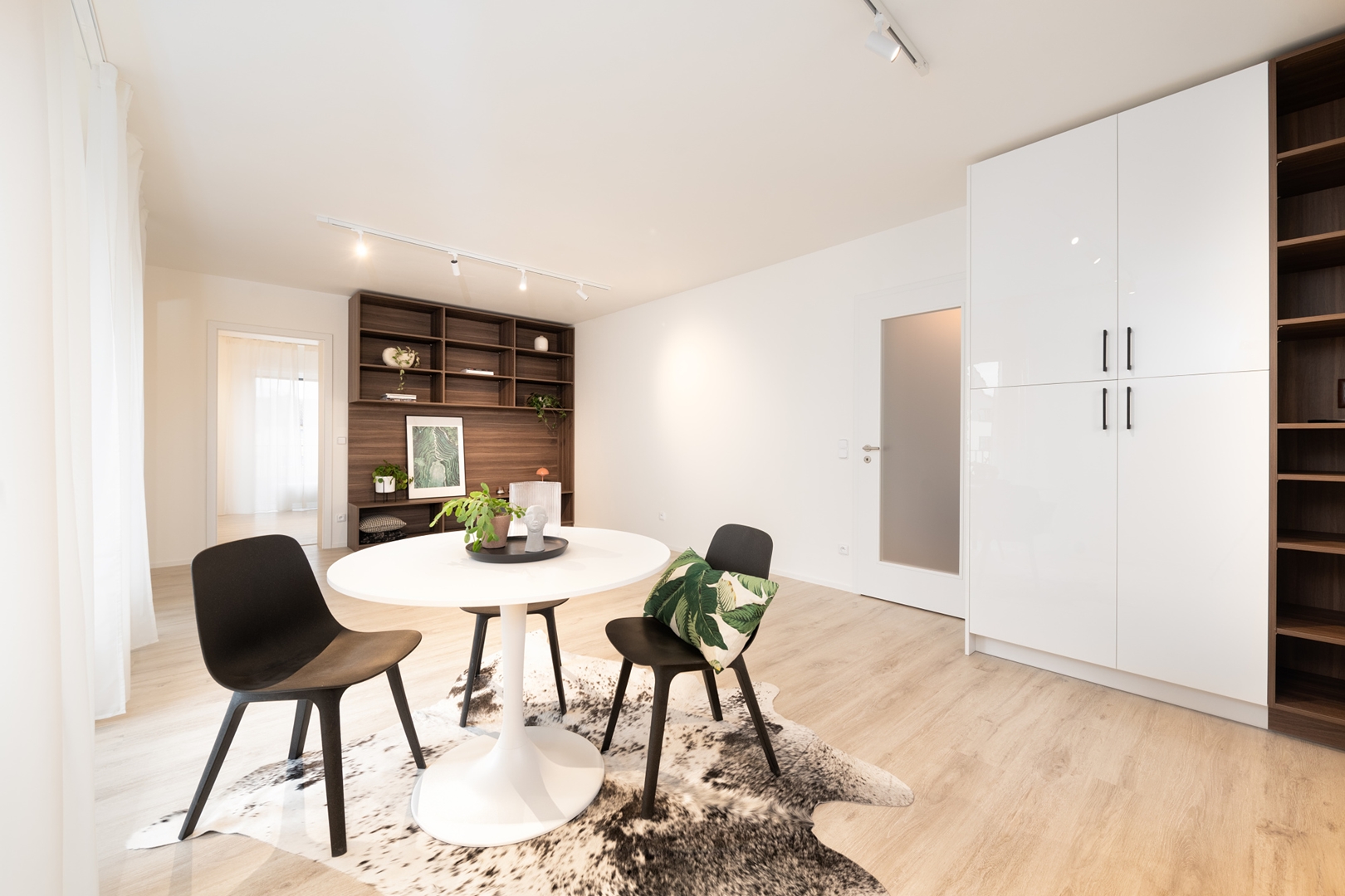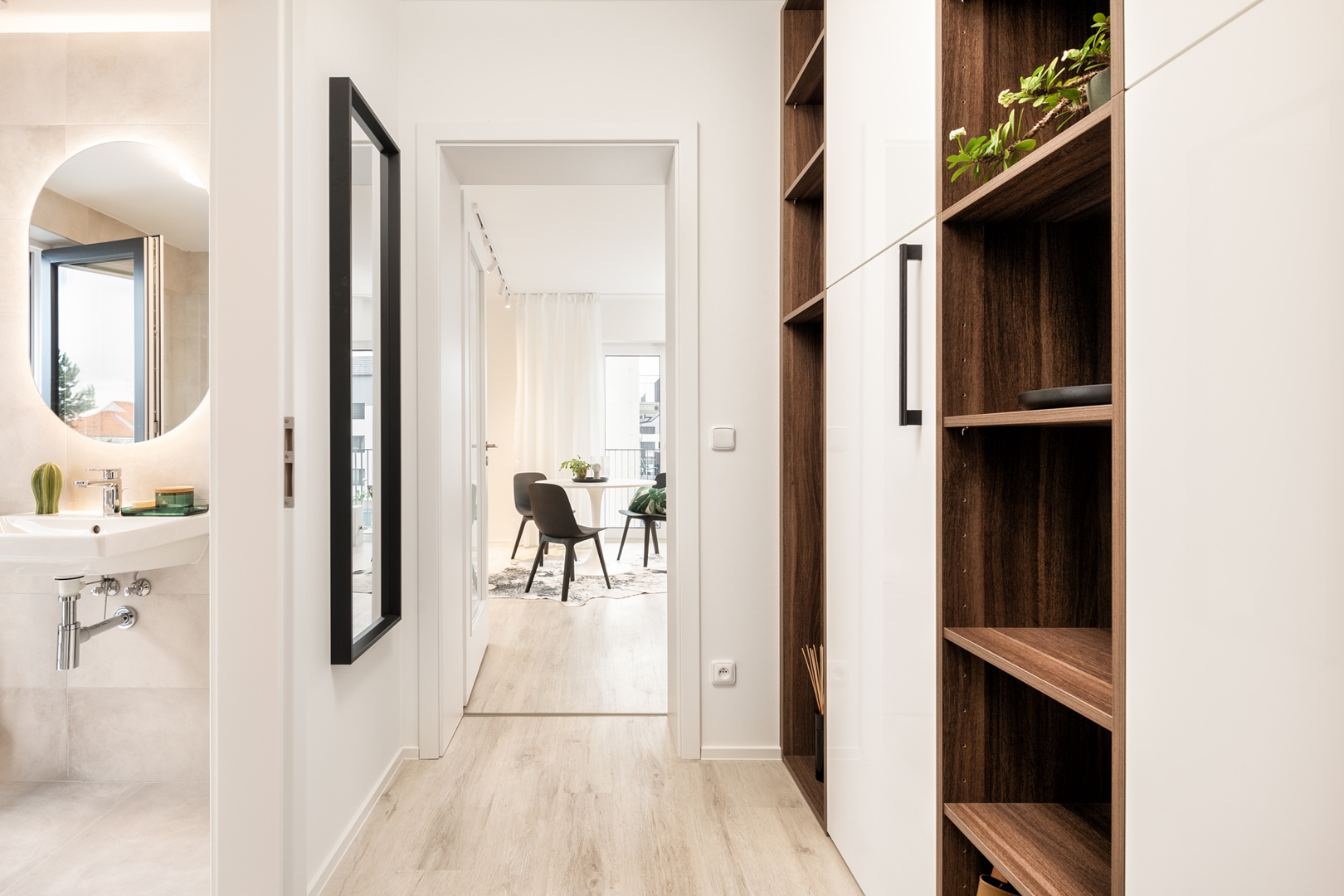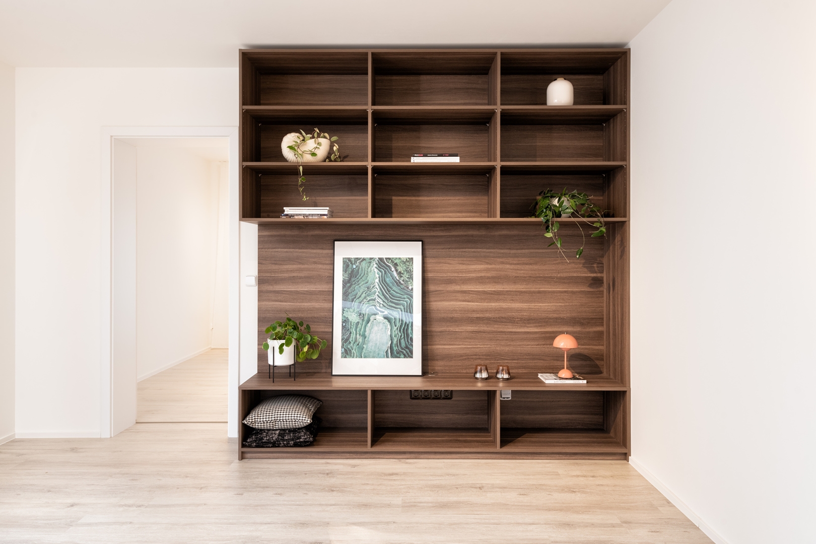 V tomhle útulném bytě jsme navrhli nábytek na míru, který pracuje s každým centimetrem – a přitom nechává prostor dýchat. Vestavěné skříně s kombinací hladkých bílých čel a otevřených nik v dekoru kávový dub.